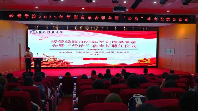为巩固军训育人成效,锚定学生需求目标,推动宿舍建设水平进一步提升,9月23日晚,经管学院在第三报告厅举行2025年军训成果表彰会暨“经治”宿舍长聘任仪式。经管学院党委副书记兼副院长牛宝卫、公寓中心主任林勇、班主任代表国贸系教授张同功,全体辅导员出席会议,2025级全体新生,各年级宿舍长代表参加会议,会议由吕欣哲主持。