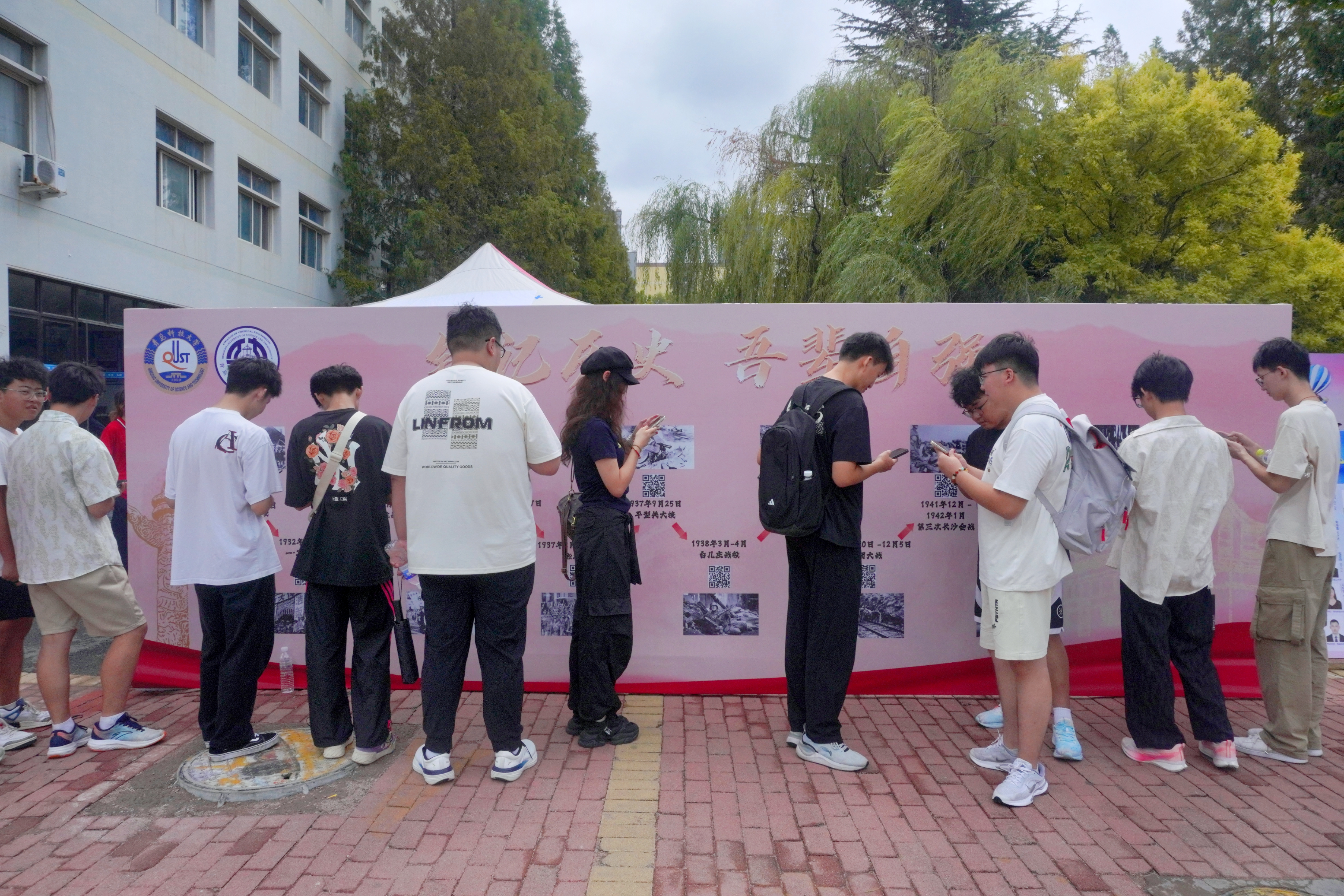 以纪念传薪火,厚植家国情怀。正值中国人民抗日战争暨世界反法西斯战争胜利80周年,搭建主题教育展板区,每张图片下方都附有二维码--新生扫码即可观看相关视频,让新生学习抗战精神,厚植家国情怀,共筑红色“信念墙”,让爱国主义的种子在入学之初便在心底扎根,引导新生以史为鉴,砥砺“强国有我”的初心。