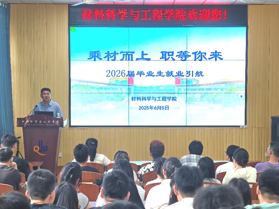 为调动2026届毕业生求职积极性,引导学生了解就业形势、明确职业方向、提升求职能力,材料学院于6月5日在学院楼101举办乘“材”而上 职等你来—2026届毕业生就业动员会,学院党委副书记兼副院长葛夫国、研究生辅导员刘爽出席会议,2026届全体研究生毕业生参会。