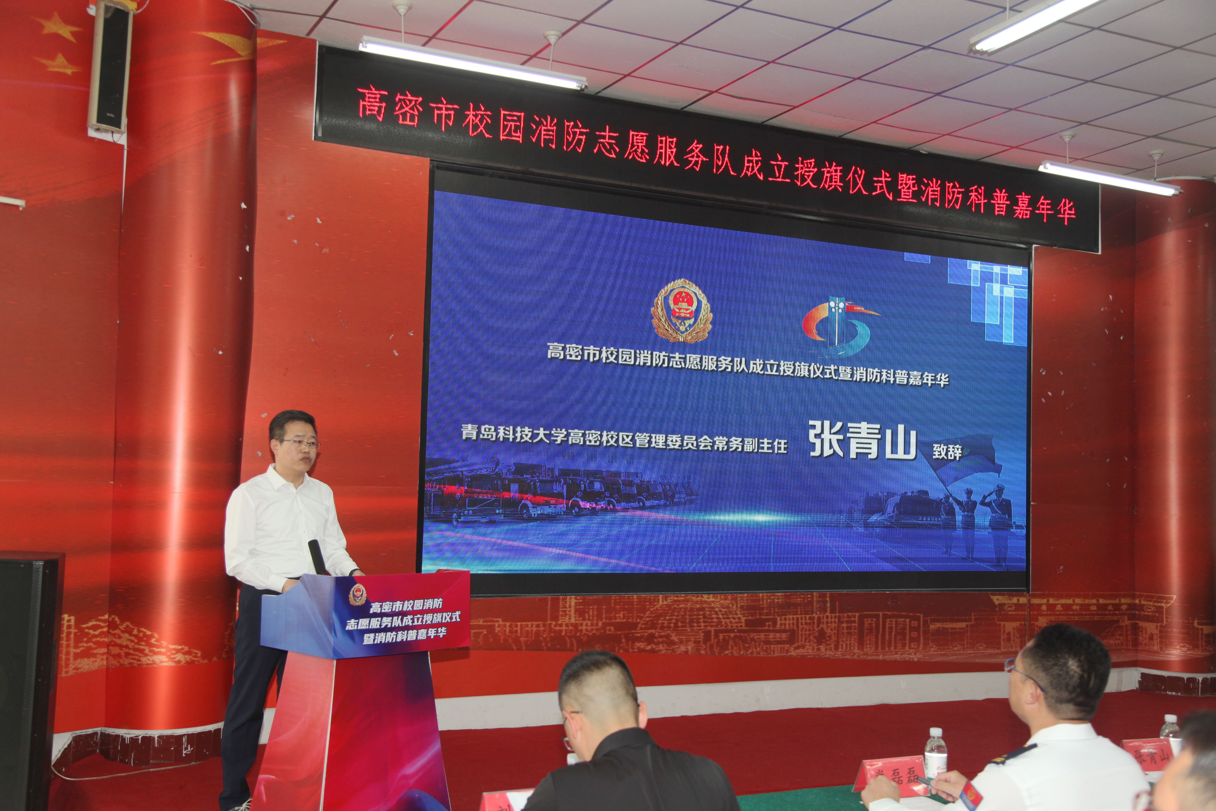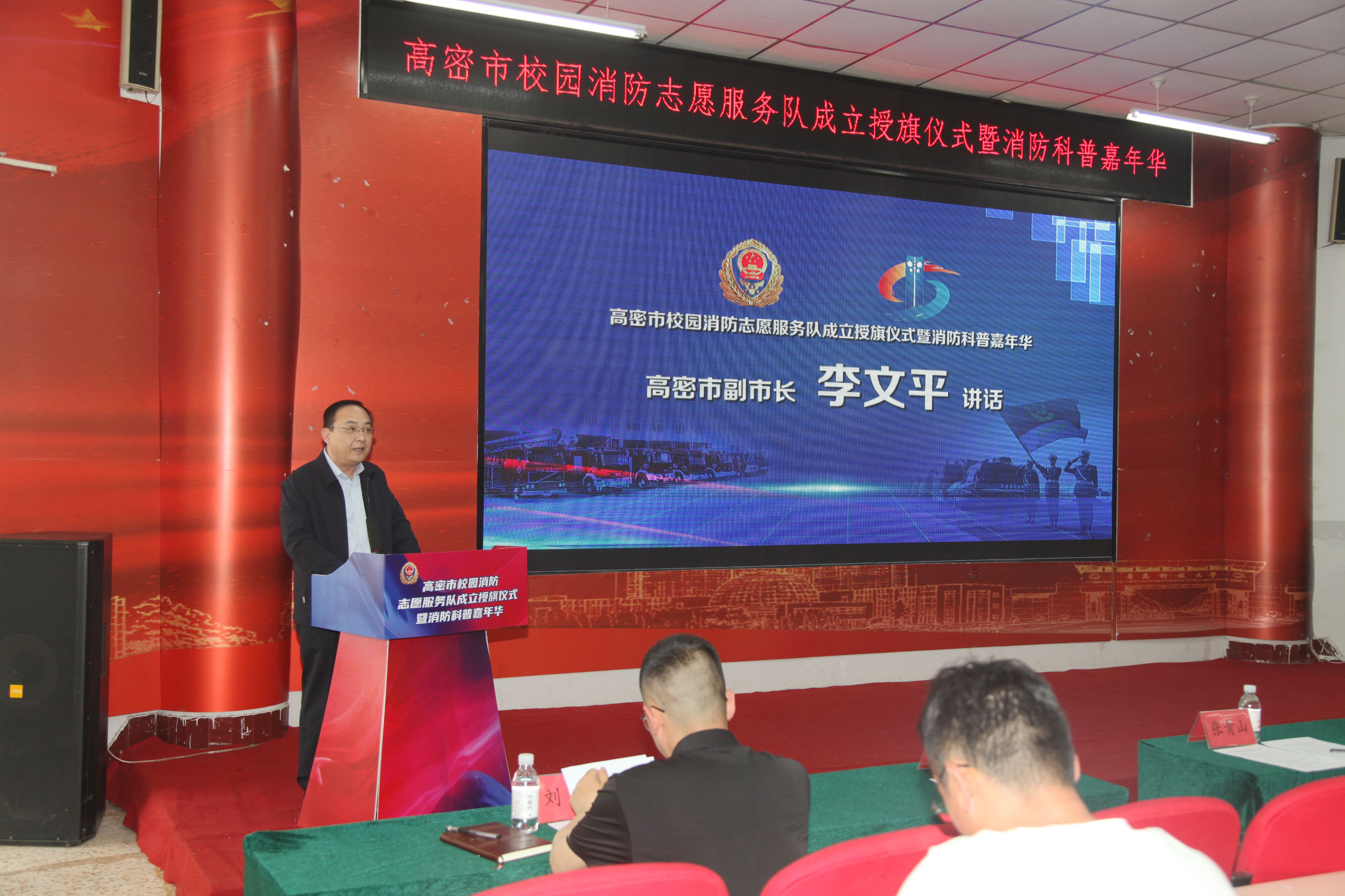 为进一步健全完善消防志愿服务工作体系,推动校园消防志愿服务活动规范化、制度化、常态化,推进平安校园建设,5月13日,高密市校园消防志愿服务队成立授旗仪式暨消防科普嘉年华活动在高密校区通德会堂举行。高密市副市长李文平,校区管理委员会常务副主任张青山出席会议并讲话。高密市消防救援大队队长娄磊磊主持会议。