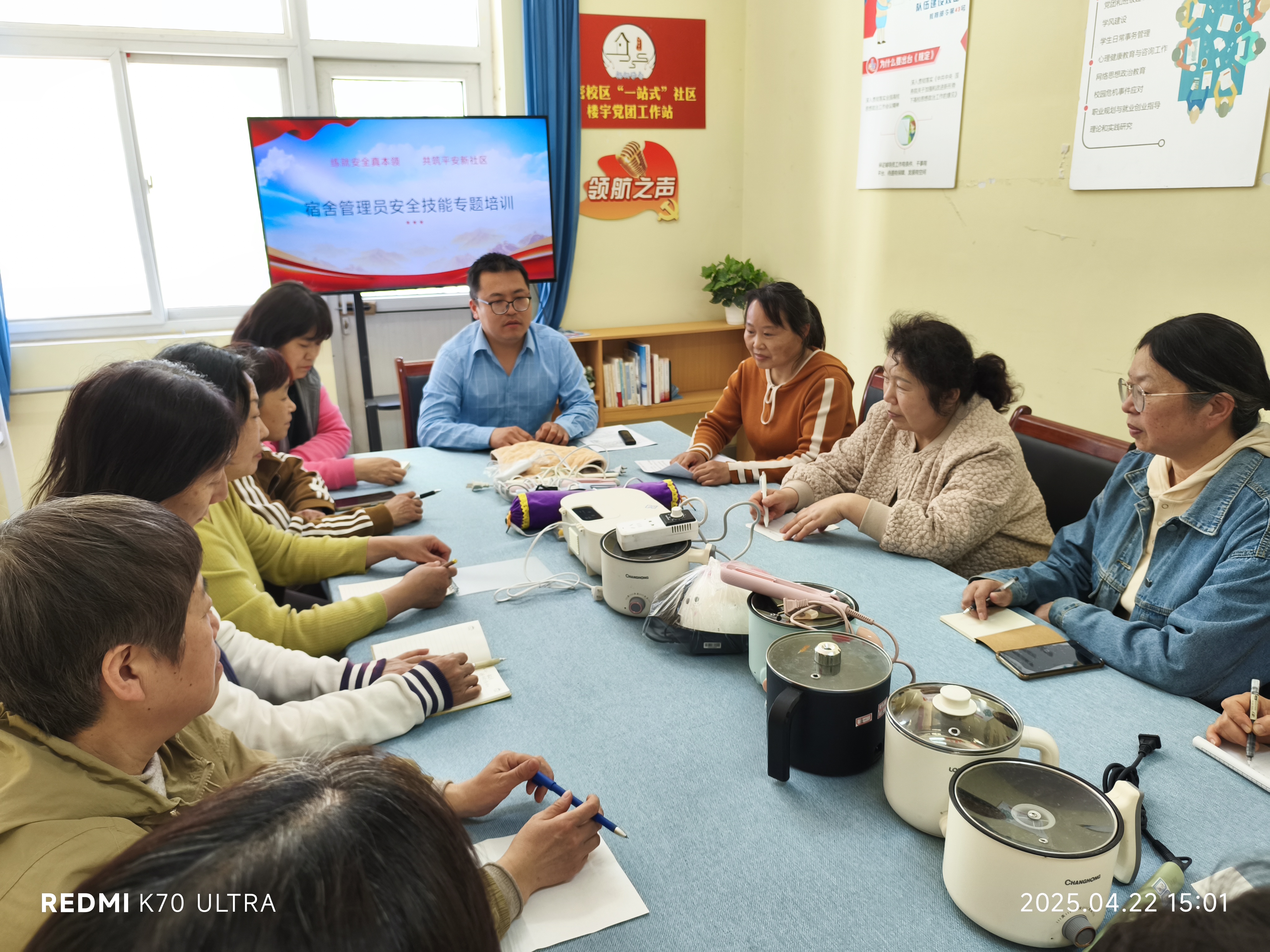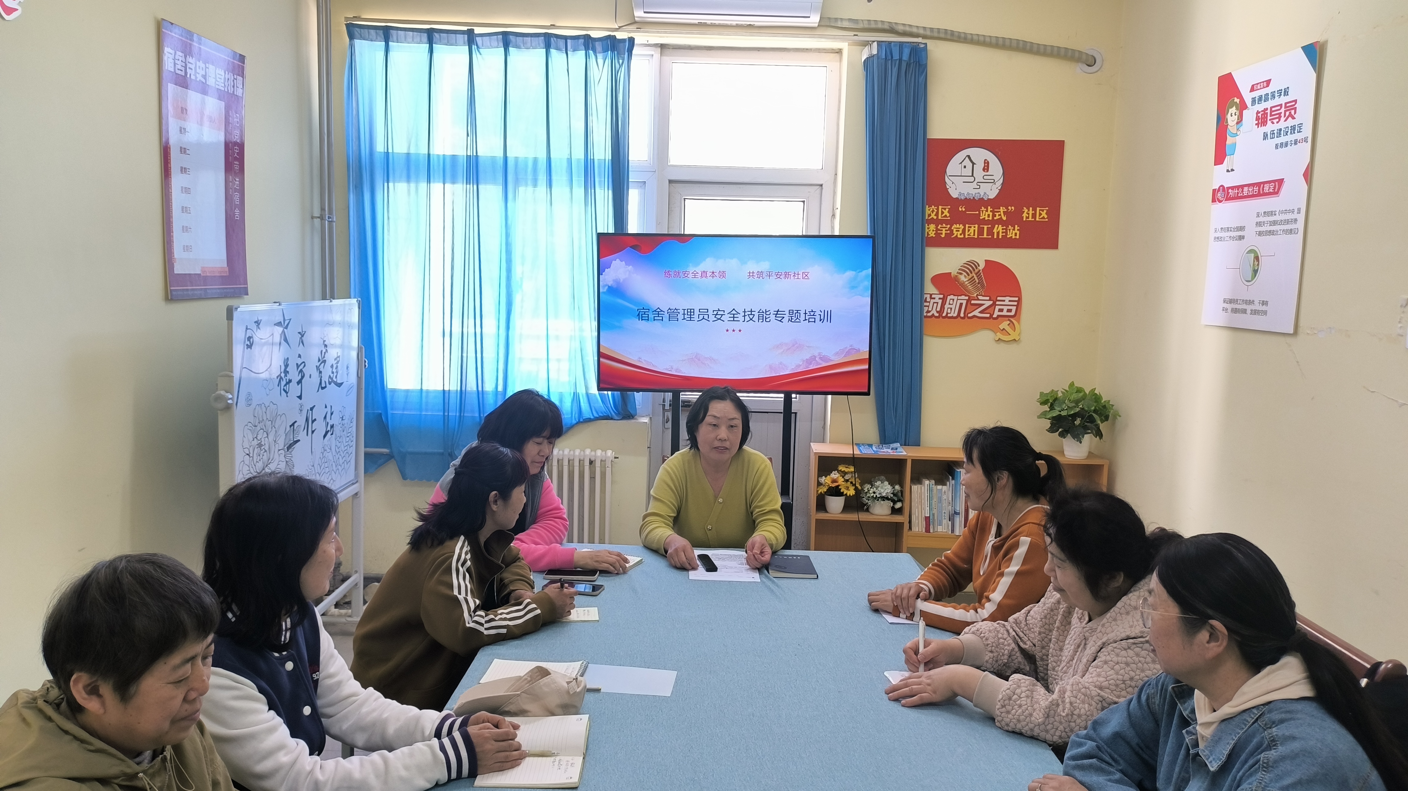 经验交流:老带新共话“平安经”。在“我的安全故事”分享会上,管理员于丽华讲述了如何通过“望闻问切”工作法(望走廊、闻异味、问详情、查细节)及时发现并处理安全隐患;管理员李凤英结合退休前的医护经验,分享了学生常见疾病预防与应急处理技巧,助力学生养成健康生活习惯。