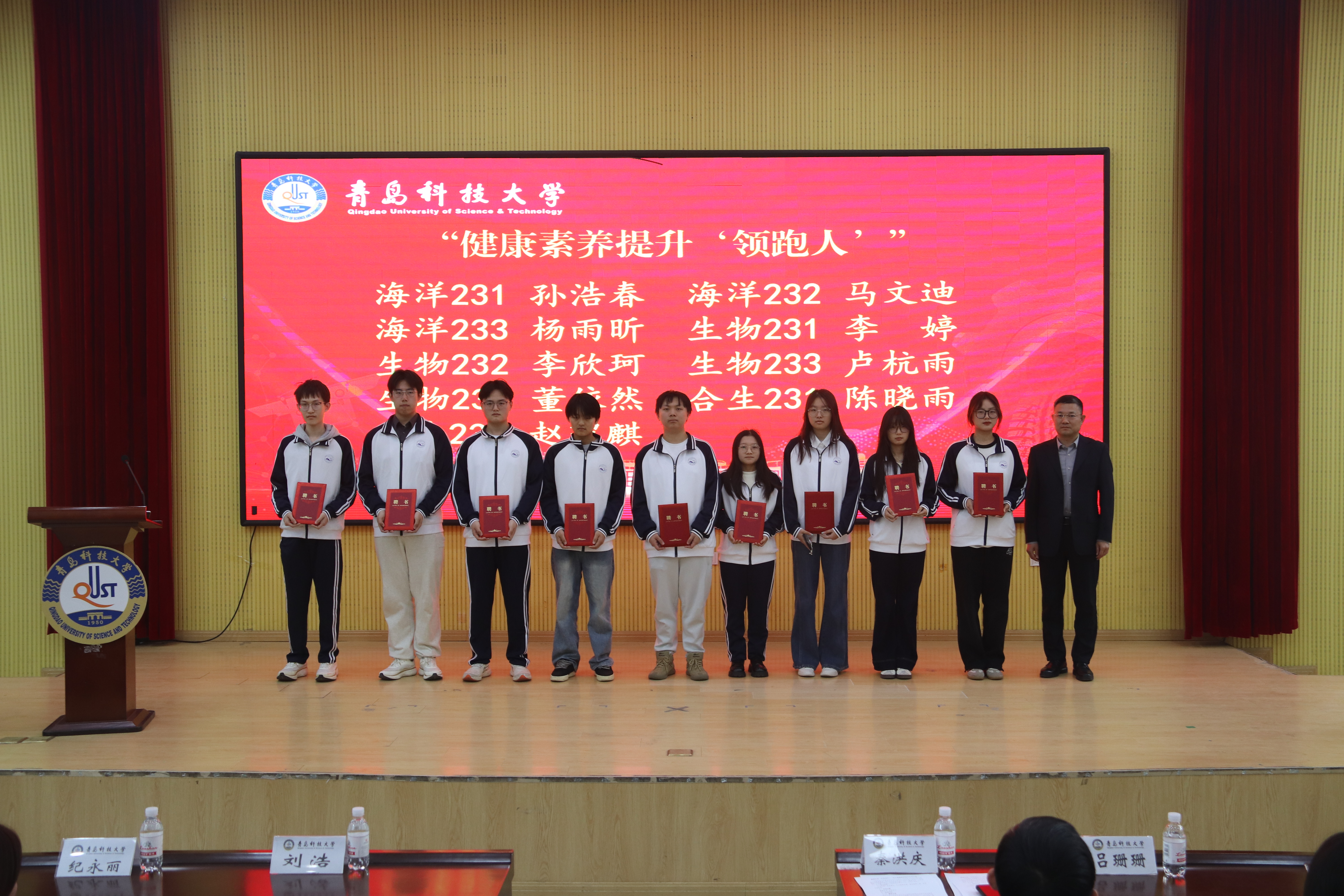 刘浩为“健康素养提升‘领跑人’”颁发聘书。他在总结讲话中强调了健康素养的重要性,指出健康是人生宝贵的财富和学习生活的基石,只有德智体美劳五育协同发力,才能筑牢健康根基。他希望领跑人代表勇担责任,发挥榜样作用,带领生物工程学院学生积极参与到体育活动中,展现青春活力,养成健康体魄,塑造健康人格,实现全面发展。