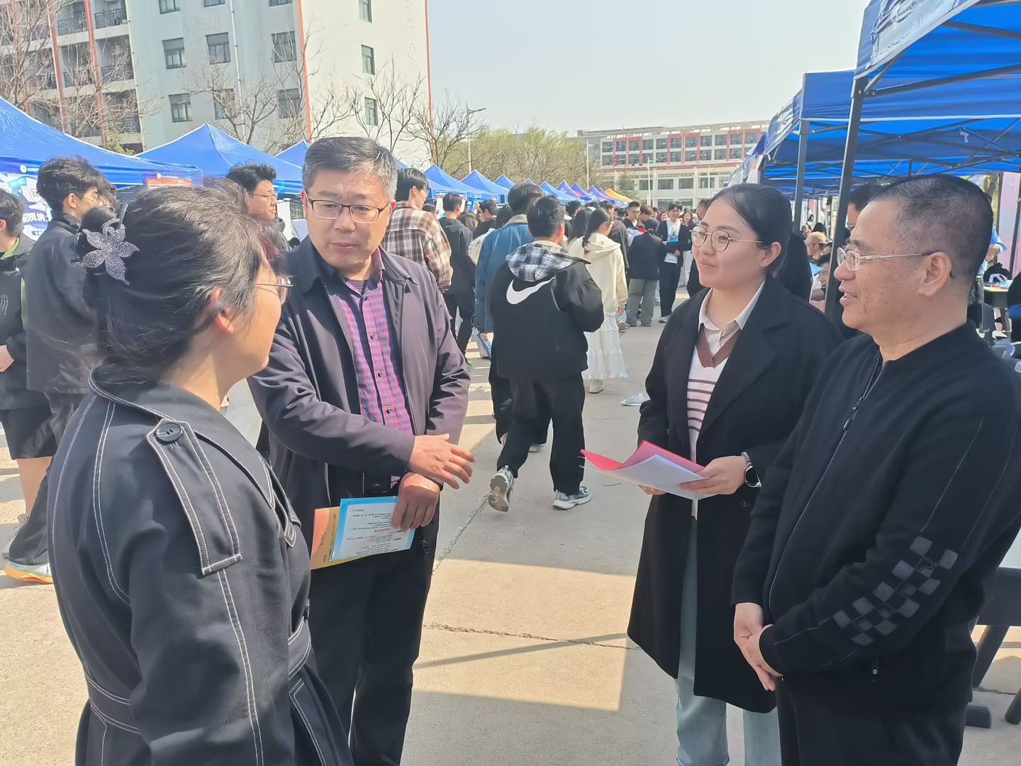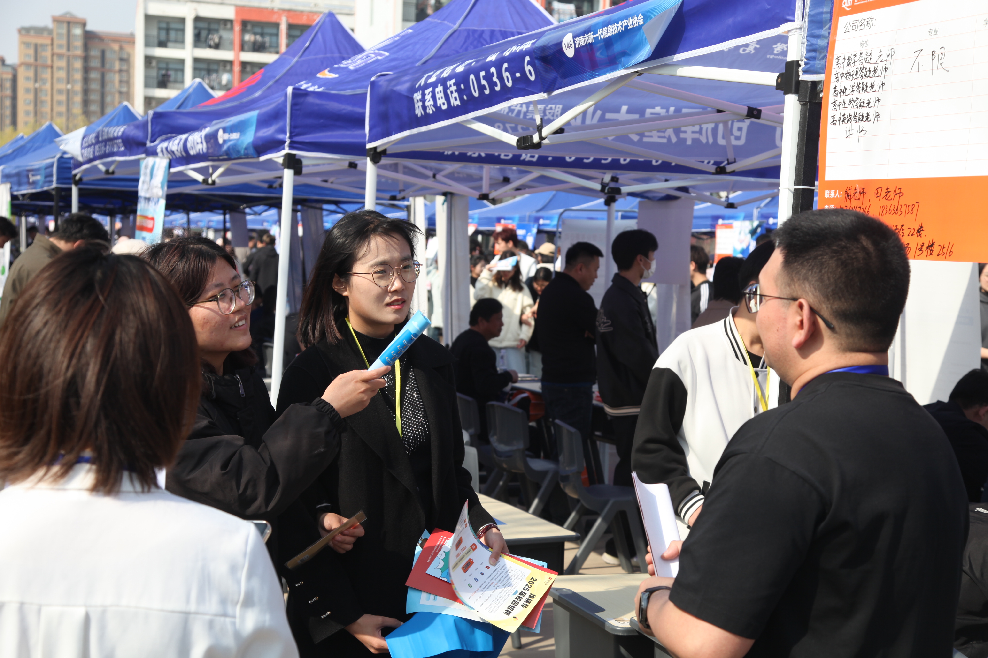 4月1日下午,高密校区“青春扬帆 职向山海”2025届毕业生春季双选会在明镜湖畔举行。本次双选会吸引了省内外近20个地市的184家企业参会,主要涵盖石油化工、新能源、新材料、人工智能、高端装备、信息技术、生物医药、教育、纺织等多个行业和领域,提供岗位5600余个,涵盖校区所有专业。本场招聘会投递简历1398份,参加面试469人次,初步达成就业意向206人.