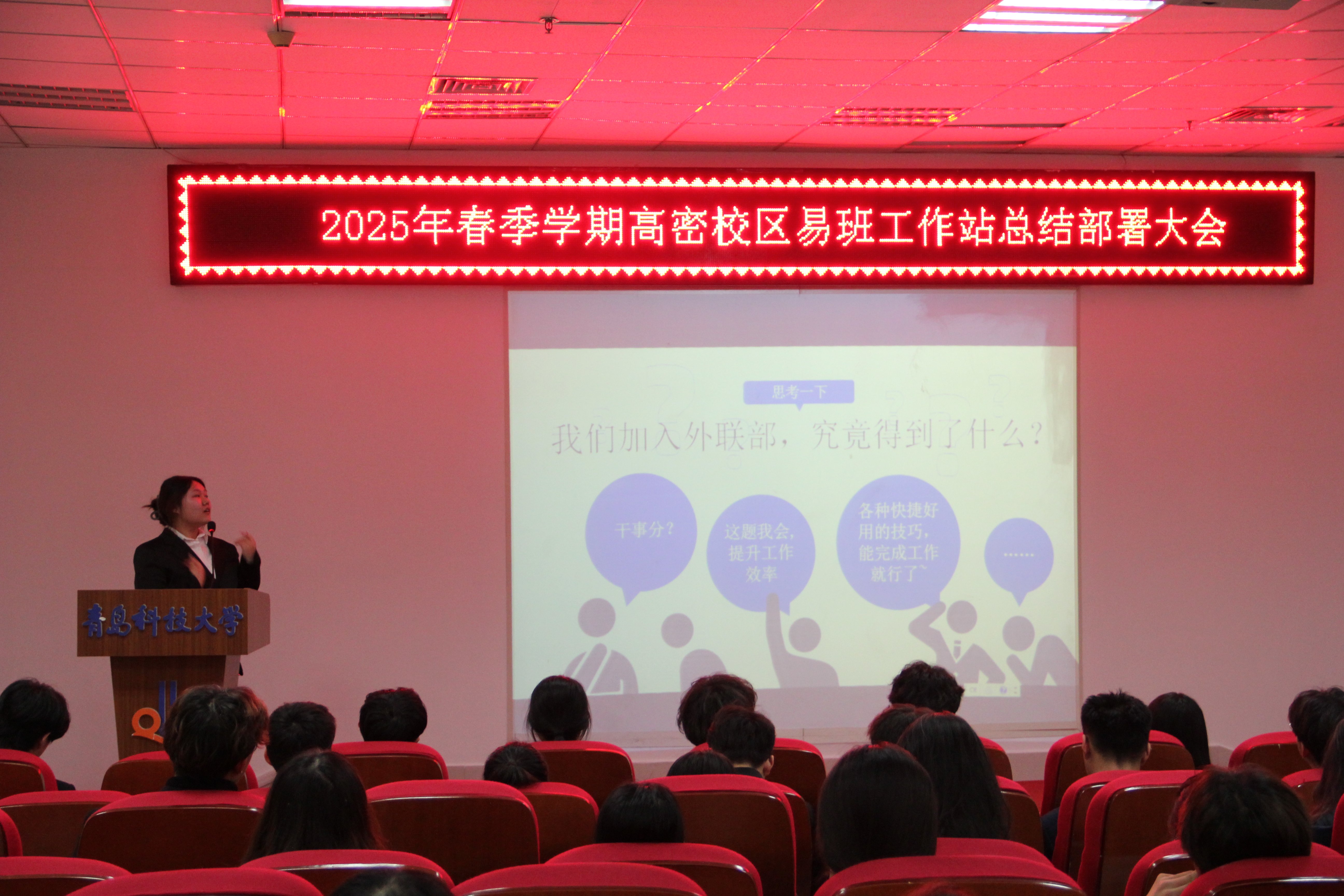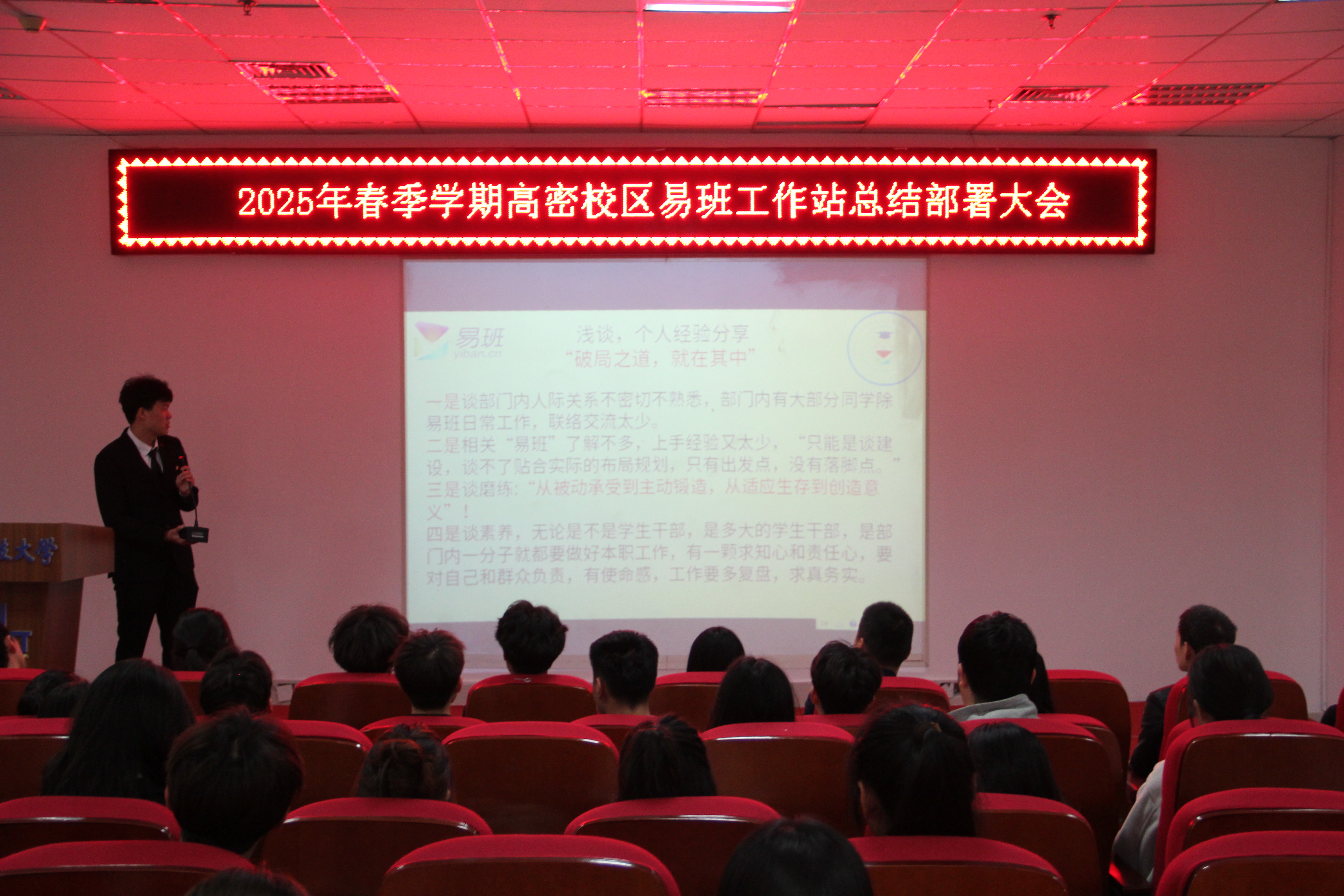 领航致远:聚势赋能启新程。会议对上一学期易班工作站的工作进行回顾总结,并要求易班成员积极尝试新事物、突破自我,不断学习新知识和新技能,发挥自身优势,通过团结协作推动易班工作站建设,为师生提供更优质服务。会议强调,新学期要以易班为基础提升高密校区网络思政能力,深化新时代网络思想政治工作改革创新。具体要做到“四个结合”,即考核与成长结合、线上与线下结合、AI 与 HI 结合、业务与管理结合,推动 “易班 +” 模式发展,促进易班全方位多层次发展,助力学校完成新时代思想政治工作 “1+6” 的目标任务。