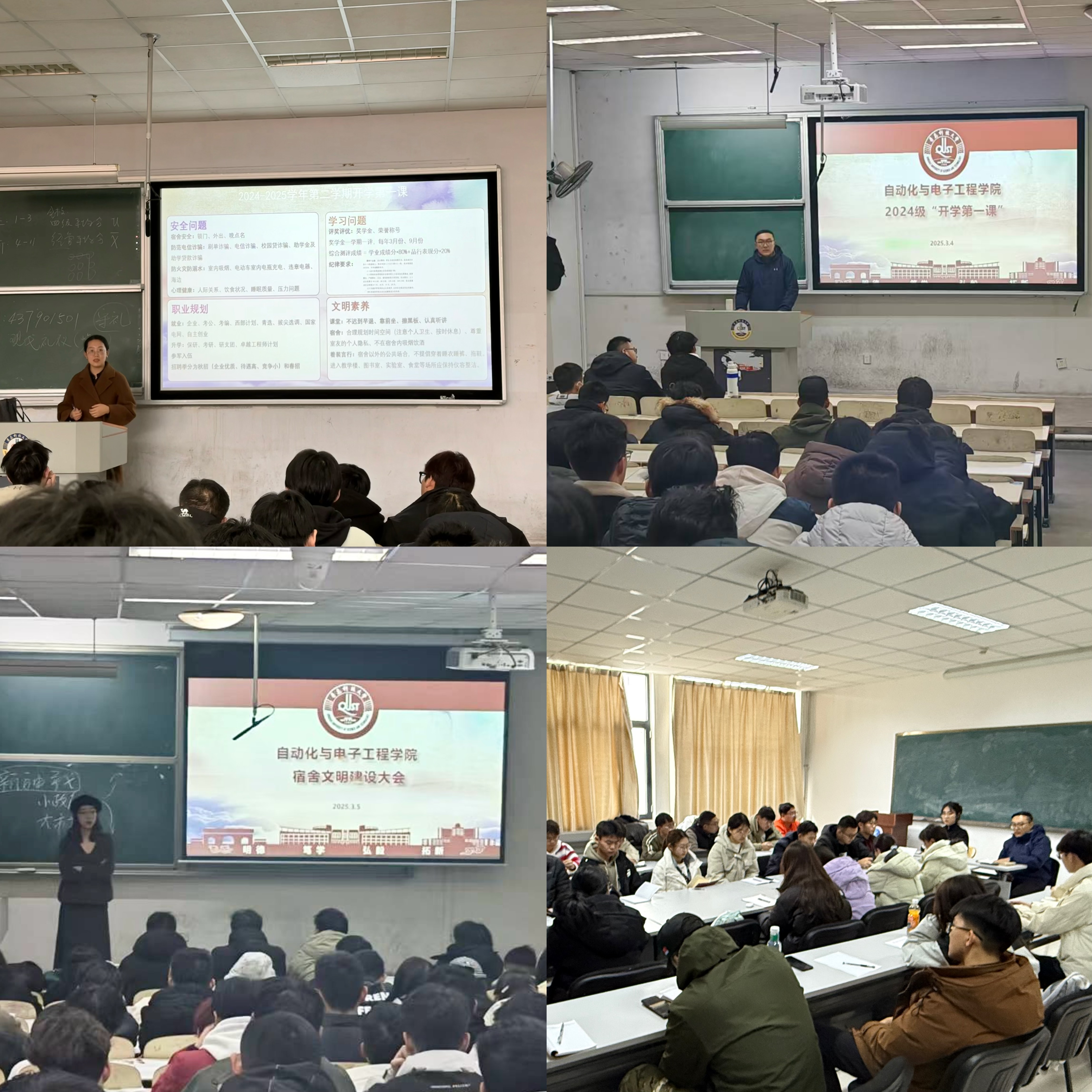 双核驱动:专业精神与思政教育同频共振。学院以“自动化人精神”与“AI自动化,做智行者”学生工作品牌“知行合一”理念双核驱动,上下联动上好开学第一堂思政课,通过党政领导班子讲情怀、班导队伍讲规范、朋辈学长讲成长,在“技术向善”微辩论中审思创新伦理,实现专业认知与价值引领的同频共振。立足“三讲一实践”活动体系,将“胸怀祖国、自立自强、协同创新、追求卓越”的自动化人精神具象化为可触达的成长坐标。安全筑基:构建全场景防护体系。实施“安全铁三角”教育模式:宿舍安全闭环治理,推行“自查-抽查-整改”闭环管理,重点清理消防安全通道、整治违规电器等隐患;实验室安全准入机制:建立“教育—考核—追责”全链条管理体系,学习《实验室安全操作守则》,违规者取消实验资格并纳入诚信档案;网络安全靶向防御,列举“钓鱼邮件窃取实验数据”“虚假竞赛报名链接”等12类新型骗局,总结“不轻信、不点击、不泄露”防护原则。学风固本:打造立体化培育机制。将“知行合一”理念融入学风建设全链条。课堂管理方面,构建“课前一课中一课后”三维管理体系:课前落实“提前5分钟到课、擦黑板、手机入袋”规范;课中推行“零手机课堂”“靠前坐”制度;课后通过“班委点名—朋辈督学—班导抽查”三级监督强化行为内化。建立“学术诚信红黑榜”,公开考试作弊等典型案例,推行“课业预警-朋辈帮扶-教师督导”三级联动,将课堂表现纳入综合测评,形成“不敢违、不能违、不想违”的学风建设生态。文明塑形:深化知行合一实践。推行“学践融合”文明养成计划:以“AI家驿站”一站式学生社区建设为抓手,将宿舍管理与育人成效深度绑定,实施“刚性约束+柔性激励”,组织逐条研学《伟德国际1949官网自动化与电子工程学院宿舍文明行为规范》,自主制定《寝室作息表》《值日轮岗制度》,建立“日常督查+突击检查+长效治理”机制,既明确“晚11点熄灯禁游戏”“叠被、开窗、断电,扔垃圾、零烟头(抽烟)、无宠物”等刚性要求,又通过“自律公约”“流动红旗”激发自主管理意识。开展“学习吧清理周”“实验室设备保养日”等劳动实践,在学习设施除尘等实操中培育“爱校如家”情怀。心理赋能:创新轻量化干预模式。开发工科生专属心理健康工具包:设计“5分钟呼吸冥想+渐进式肌肉放松”组合练习,通过腹式呼吸调节焦虑情绪,配合肩颈拉伸操缓解疲劳;实施“倾听伙伴计划”促进朋辈互助,通过同龄人经验传递抗压韧性,提升心理护航“支撑力。