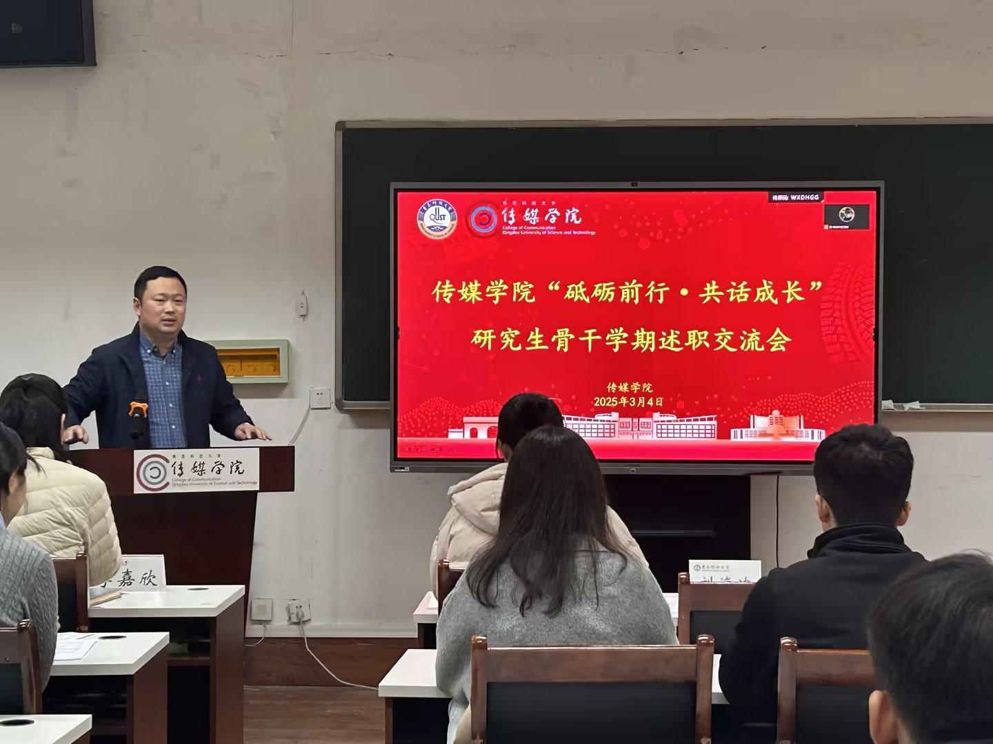 为加强学院研究生骨干队伍建设,强化述职调度和典型经验交流,营造比学赶超、互学互促的浓厚氛围,3月4日下午,传媒学院开展“砥砺前行·共话成长”研究生骨干学期述职交流会。学院党委副书记兼副院长刘海波,研究生教学秘书陶雪莲,全体辅导员,学院研究生会主席团及全体部长,2023级各班班长、团支书,2024级各班班委参加会议。