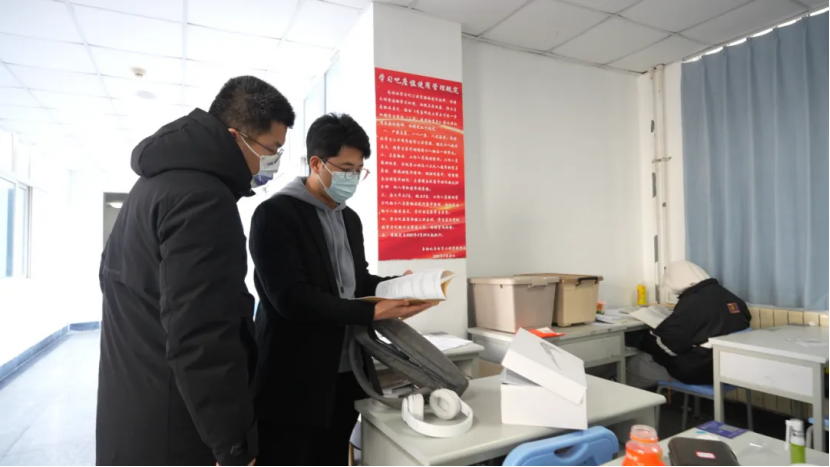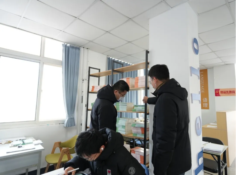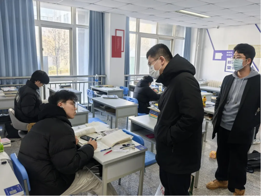 走访过程中,老师们集体查看了“AI家驿站”建设情况,督促“党员先锋岗”党员认真值守,维护卫生秩序。刘名森与学习的同学交流,详细询问了同学们的学习进度、复习计划以及遇到的困难。针对同学们提出的问题,老师们和学生党员耐心解答,并提出了针对性的建议。