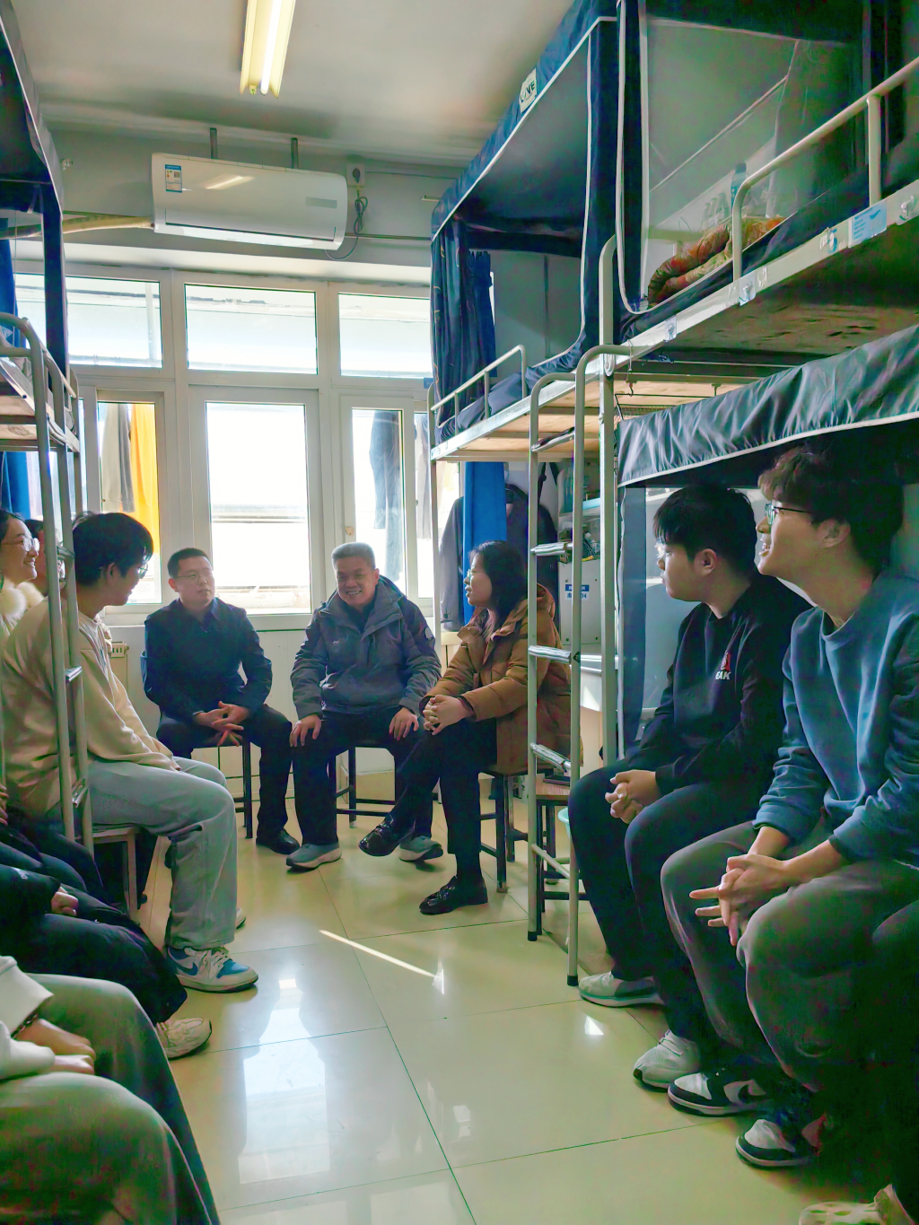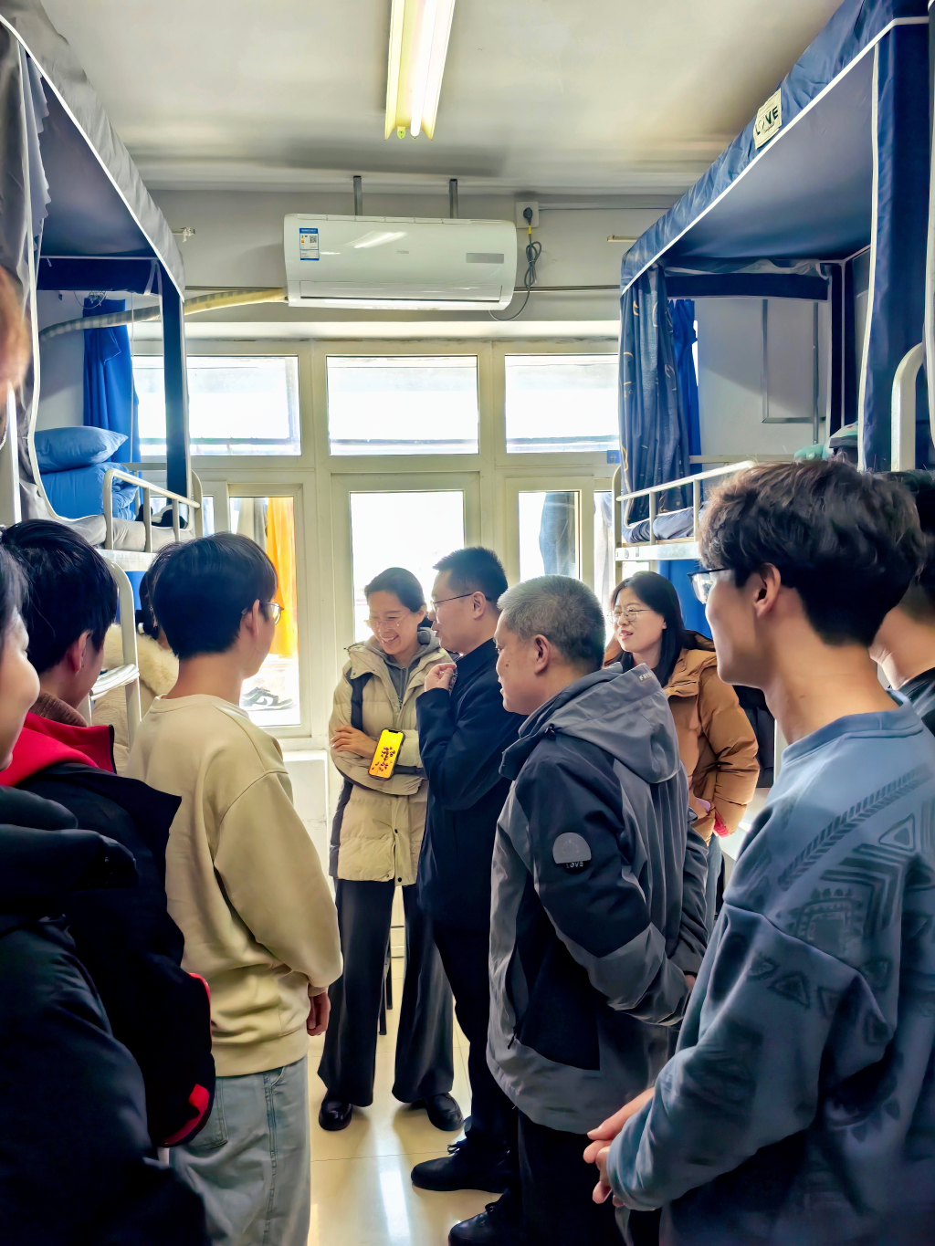 为做好“年末+期末”的节点教育,深入了解学生的思想动态、备考进度及心理状态,12月31日,联系班级干部朱敬义、齐青、刘敏深入学生宿舍关怀慰问,学院党委书记刘保成、党委副书记李雯雯陪同走访。