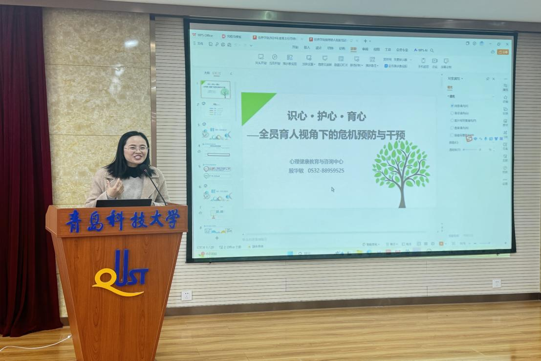 本次培训以“识心·护心·育心——全员育人视角下的危机预防与干预”为主题,殷华敏从需要---心理发展任务;冲突---常见心理危机;策略---如何干预;育心---如何预防四个方面展开培训。她指出当前大学生正处于自我同一性发展的关键时期,他们需要解决“我是谁”“我的人生价值是什么”等问题。此外,学业压力、人际关系处理和职业迷茫等问题,都会引发学生的心理冲突,影响心理健康。她详细介绍了抑郁障碍、焦虑障碍等常见心理危机,列举了具体的识别路径,包括学习成绩大幅波动、睡眠食欲异常、情绪低落或过度亢奋等表现。针对危机信号,她强调教师需学会共情式倾听,在理解学生情绪的基础上,引导学生聚焦问题并寻找解决途径。对于高风险情况,教师应及时与学校心理健康中心或专业机构合作,确保学生得到专业的干预与支持。此外,殷华敏强调在日常教学中班主任、导师要引导学生养成良好的生活习惯,包括规律作息、适度运动、均衡饮食,减少久坐等。运动可以促进脑源性神经营养因子(BDNF)的释放,帮助缓解压力、修复大脑功能,有助于心理健康的恢复。殷老师提出要通过 “五位一体”心理支持体系,协同辅导员、心理中心和学生骨干,共同守护学生的心理健康。