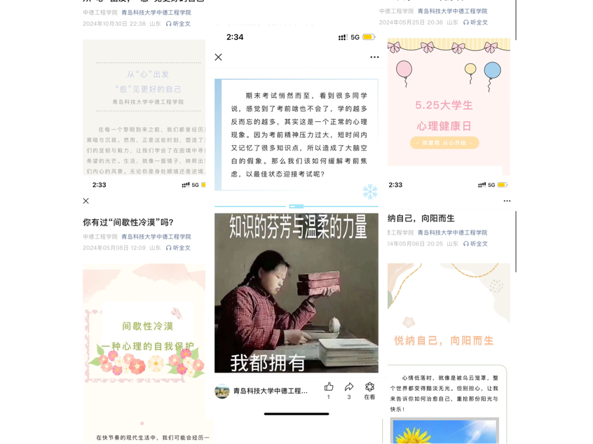 教育教学:夯实“心”基,筑牢保障。强化宣传,广泛传播,心理健康知识的宣传与普及是心理健康教育工作中重要的一部分。为了加大心理健康知识的宣传,学院公众号定期推出心理知识小课堂、设计心理宣传画、张贴宣传心理咨询电话,多途径、全环境实现心理健康教育环境的建设,全力打造一个充满人文关怀,洋溢和谐气息、滋养身心健康的校园环境。
