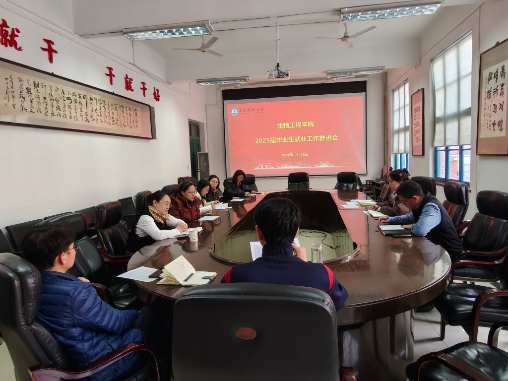 为全面推进2025届毕业生就业工作,引导毕业生树立正确的就业观念,提高就业积极性和主动性,生物工程学院于12月13日在学院会议室召开2025届毕业生就业工作推进会。会议由学院党委书记周宪锋主持,学院领导班子成员、毕业生辅导员及班主任参加会议。