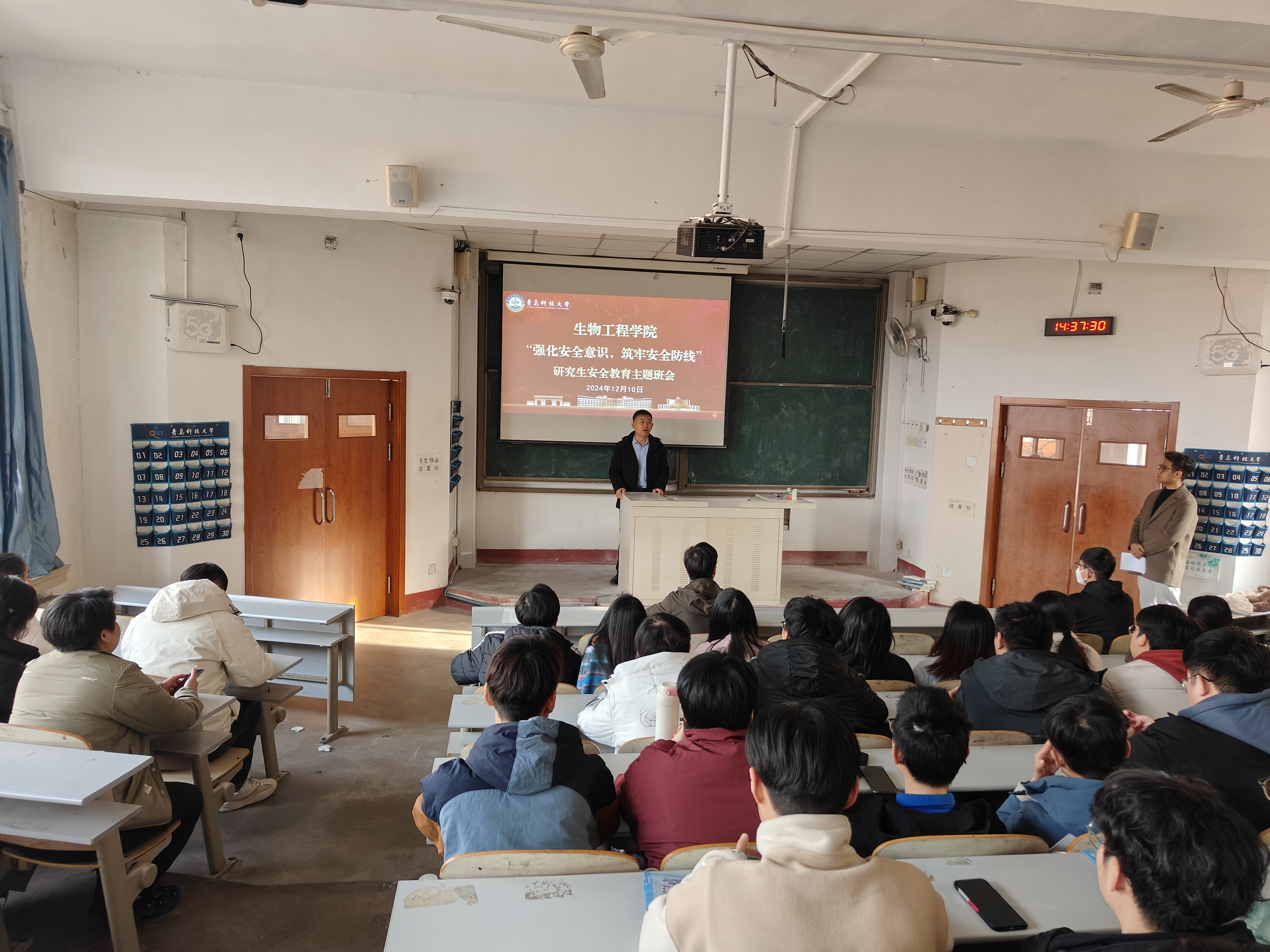 为了进一步提升研究生安全意识,有效防范各类风险,筑牢研究生安全稳定防线,12月10日,生物工程学院在二教317教室举行“强化安全意识,筑牢安全防线”研究生安全教育主题班会,生物工程学院2023级全体研究生参加班会,班会由学工办主任秦洪庆主持。