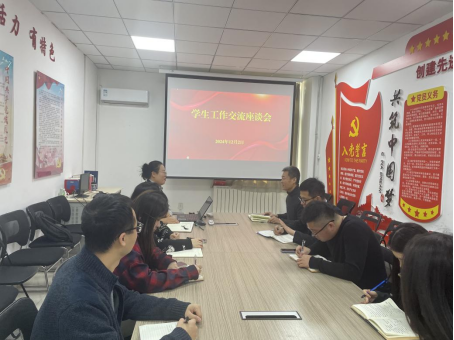 郭蒙蒙认真听取学院辅导员对学生工作中存在的困难困惑及工作开展实际情况,并为辅导员在教育管理服务学生过程中存在的问题出谋划策。