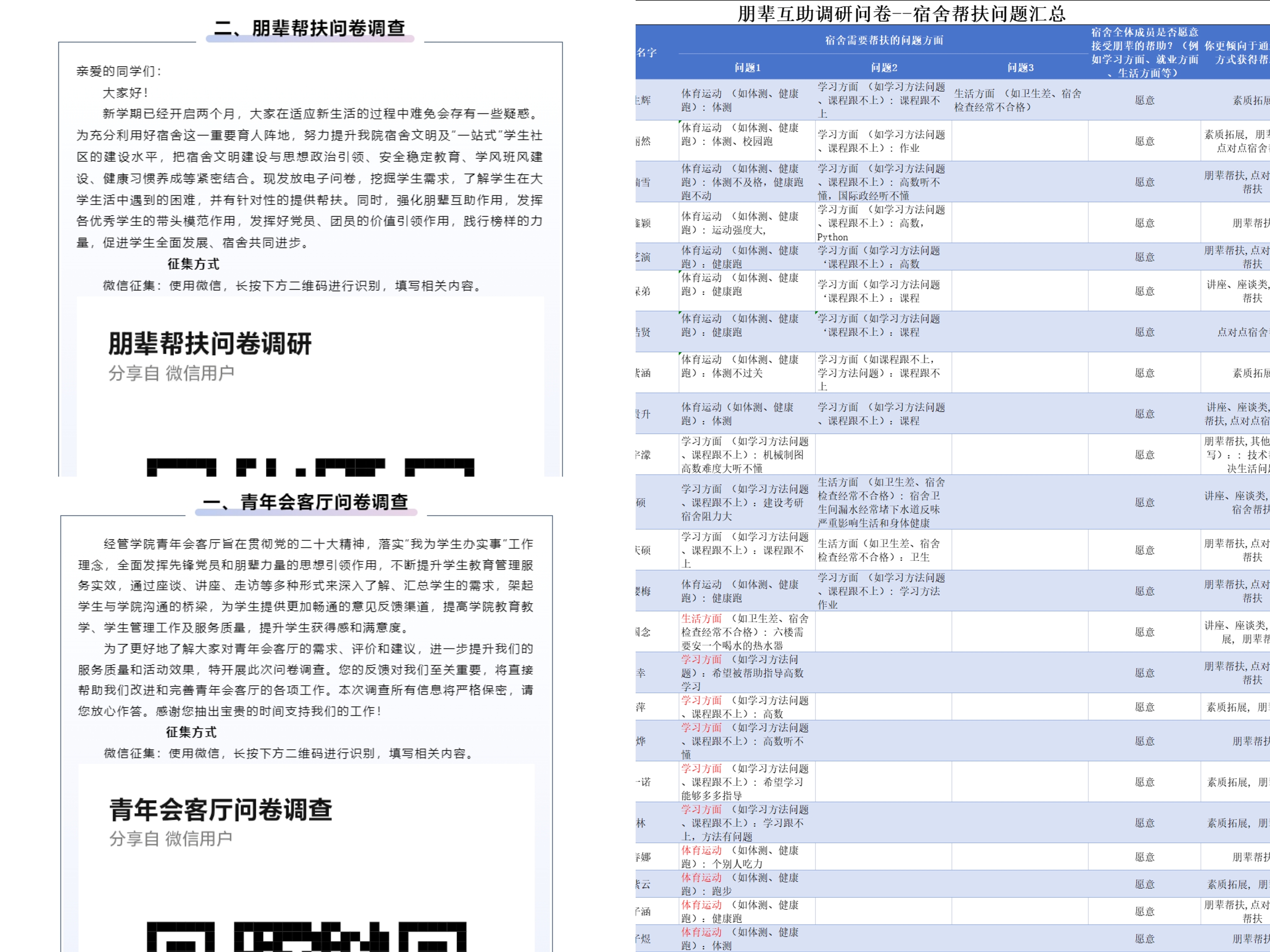 会议伊始,青年会客厅项目负责学生就2024级朋辈互助调研问卷情况进行汇报。问卷围绕宿舍帮扶问题展开,共发放46份且全部回收,精准呈现了新生宿舍的需求现状。数据显示,约50%的宿舍需要帮扶,问题集中于体育、学习、生活三大板块。其中,体育方面有14间宿舍亟待支持,学习上有18间宿舍渴望助力,生活方面有4间宿舍期待援手。