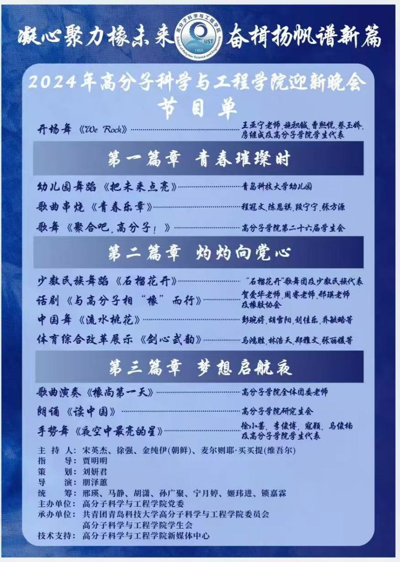 为学习贯彻党的二十届三中全会精神,进一步丰富校园文化活动,激励广大青年勇担时代之责。11月22号,高分子学院在四方校区西礼堂举办“凝心聚力‘橡’未来,奋楫杨帆谱新篇”2024级迎新晚会。高分子科学与工程学院院长张建明,校学生工作部(处)副部长尤亭亭、团委副书记李航,高分子科学与工程学院副院长王庆富、孙举涛、刘恒、党委副书记兼副院长贾明明,2024级新生班主任、全体辅导员参加了本次晚会。全国三八红旗手、泰山学者贺爱华教授参演,结合自身在校求学经历,现场为同学们上了一堂青春思政课。