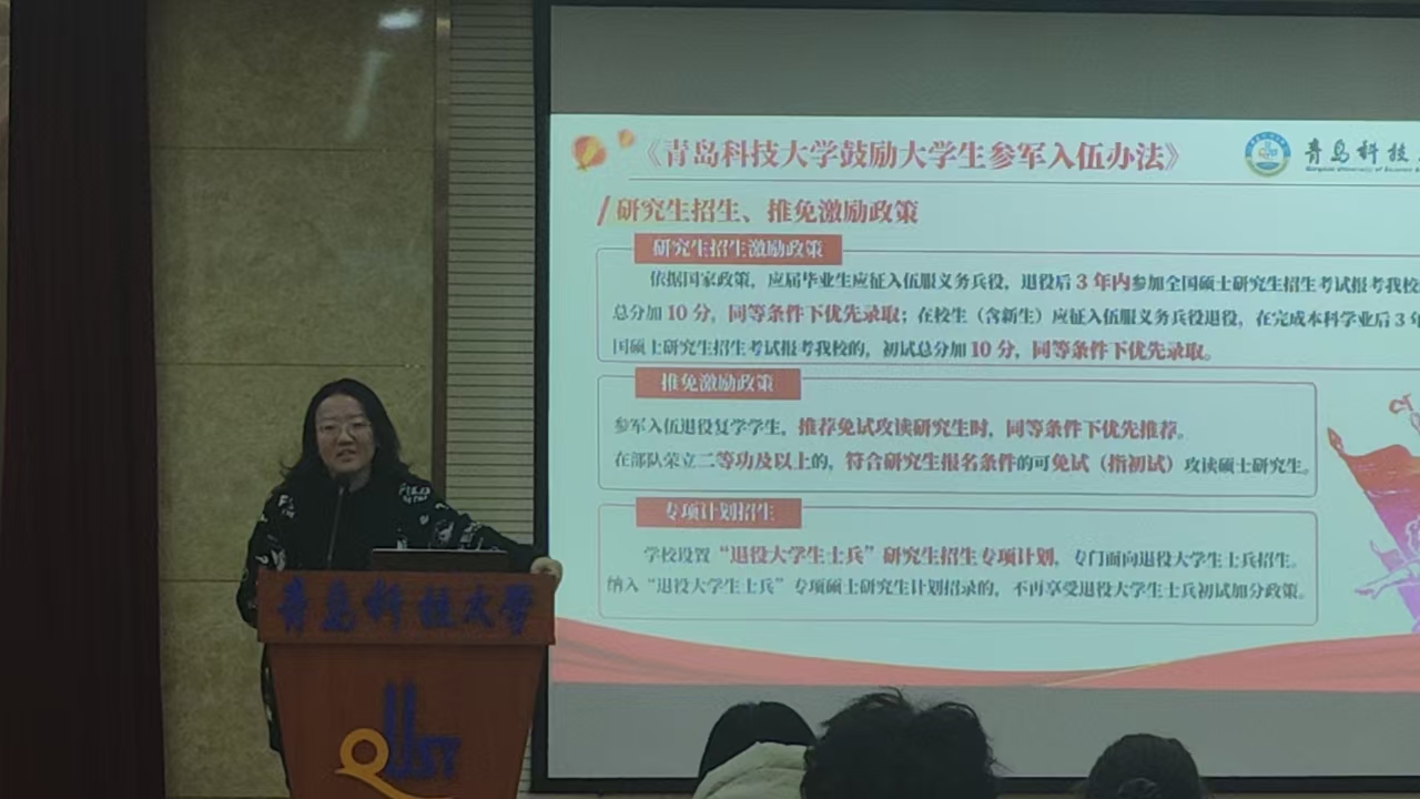 第一环节,丛文翠对大学生入伍享受的国家优惠政策及学校下发的《伟德国际1949官网鼓励大学生参军入伍办法》(青科大字〔2024〕14号)进行解读,从学生关切出发,帮助学生厘清“三笔账”,分别是“政治账”“发展账”和“经济账”。第二环节,退伍学生刘骐鸣、李业兴分别从考研经历、军旅生涯以及体检注意事项等多方面入手,分享入伍经验,并就现场同学提出的问题进行细致解答。