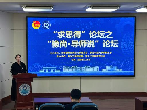 为增强师生之间的学术交流,营造良好的科研氛围,培育研究生的科学探索精神和严谨的学术态度,积极吸纳科学研究的深层知识与实践技能,11月6日,高分子学院团委、研究生会在高分子学院阿朗新科报告厅举办 “求思得”论坛之“橡尚·导师说”论坛。本次论坛邀请了高分子学院阚泽副教授担任主讲嘉宾,高分子学院辅导员马艺慧老师作为主持人,超100名研究生参与。