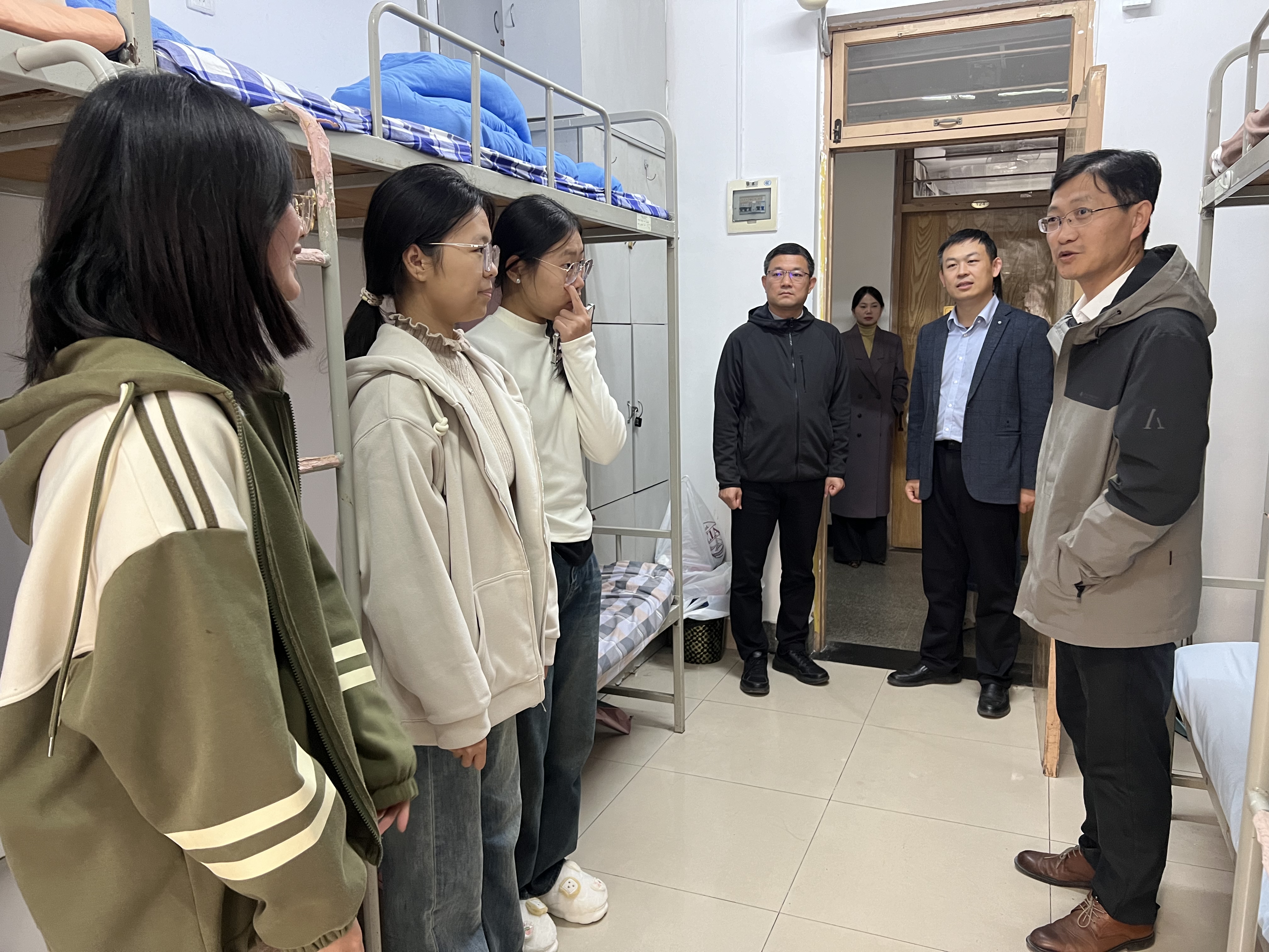 在走访活动中,领导和老师们深入学生生活一线,与同学们展开了温馨而亲切的交流,鼓励他们继续维护并提升良好的学习氛围。期间,他们细致入微地检查了宿舍的内务整理情况、用电用水安全及卫生状况,对内务井井有条、整洁规范的宿舍给予了高度评价与表扬。同时,领导和老师们也温馨提醒同学们需适时调整个人生活状态,激励大家培养积极向上的生活态度,自觉践行勤俭节约、文明安全的日常习惯。