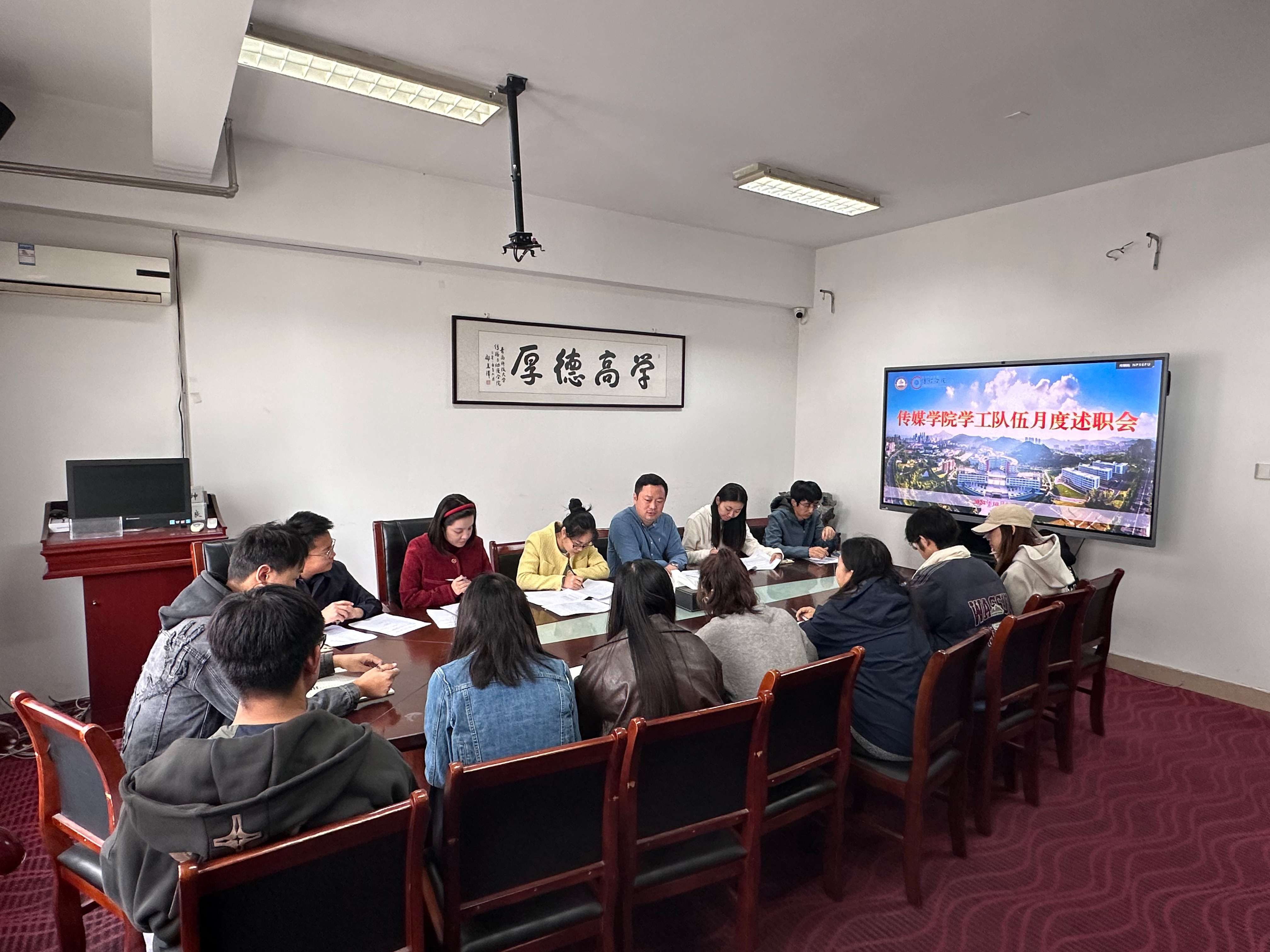 为一以贯之地抓好学工队伍建设,10月22日上午,传媒学院在315会议室召开10月份学工队伍月度述职会,学院党委副书记兼副院长刘海波,全体专职辅导员,学生会、研究生会主席团成员、“小漫姐姐”志愿服务队长,研究生助管等参加会议。会议由刘海波主持。