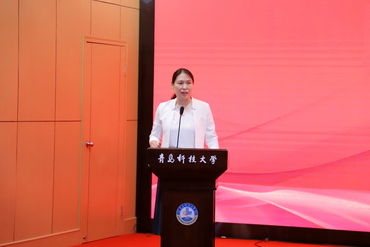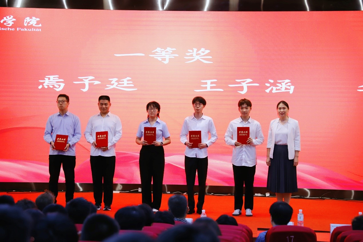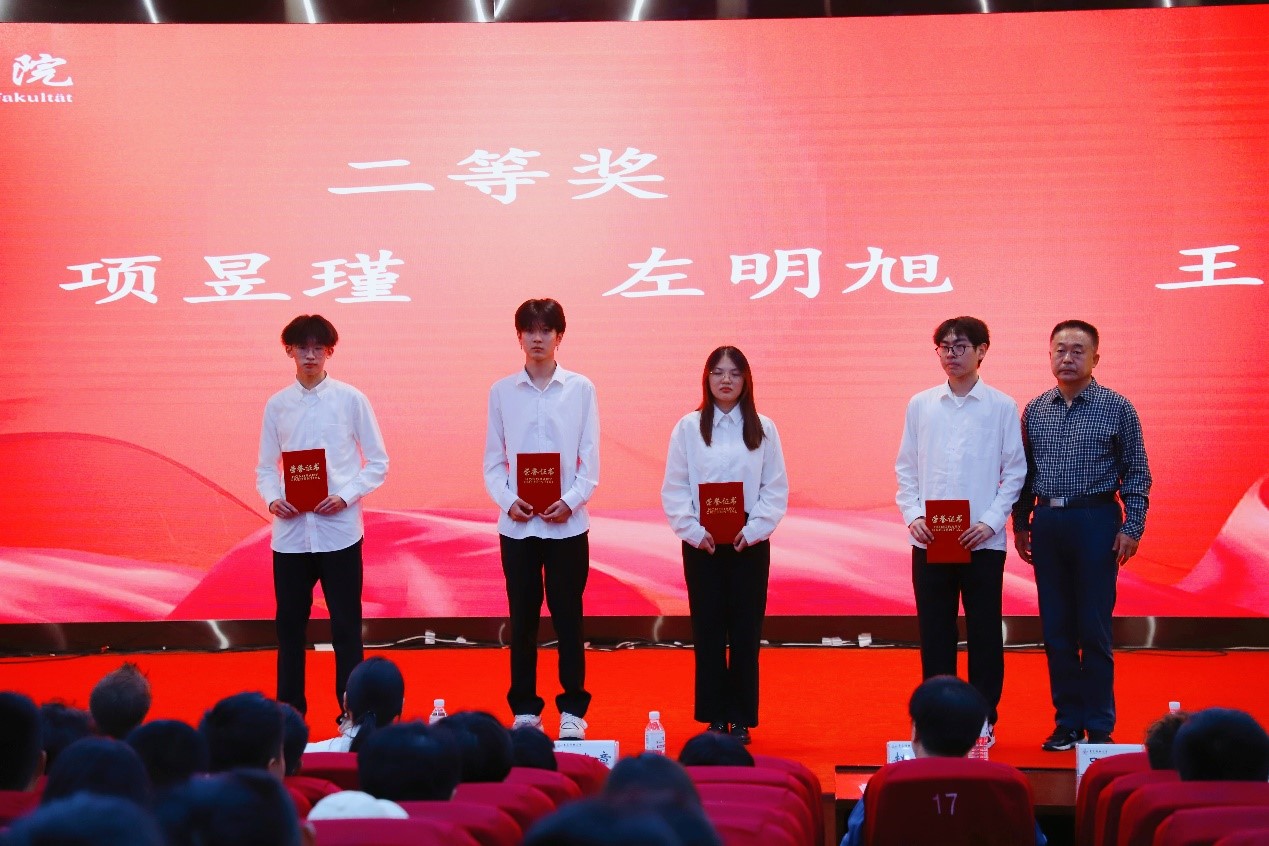 李怡然宣读了德语等级考试成绩优异学生名单,学院党委书记韩海青、副院长郭建章、赵洪滢分别为成绩优异学生颁发证书。