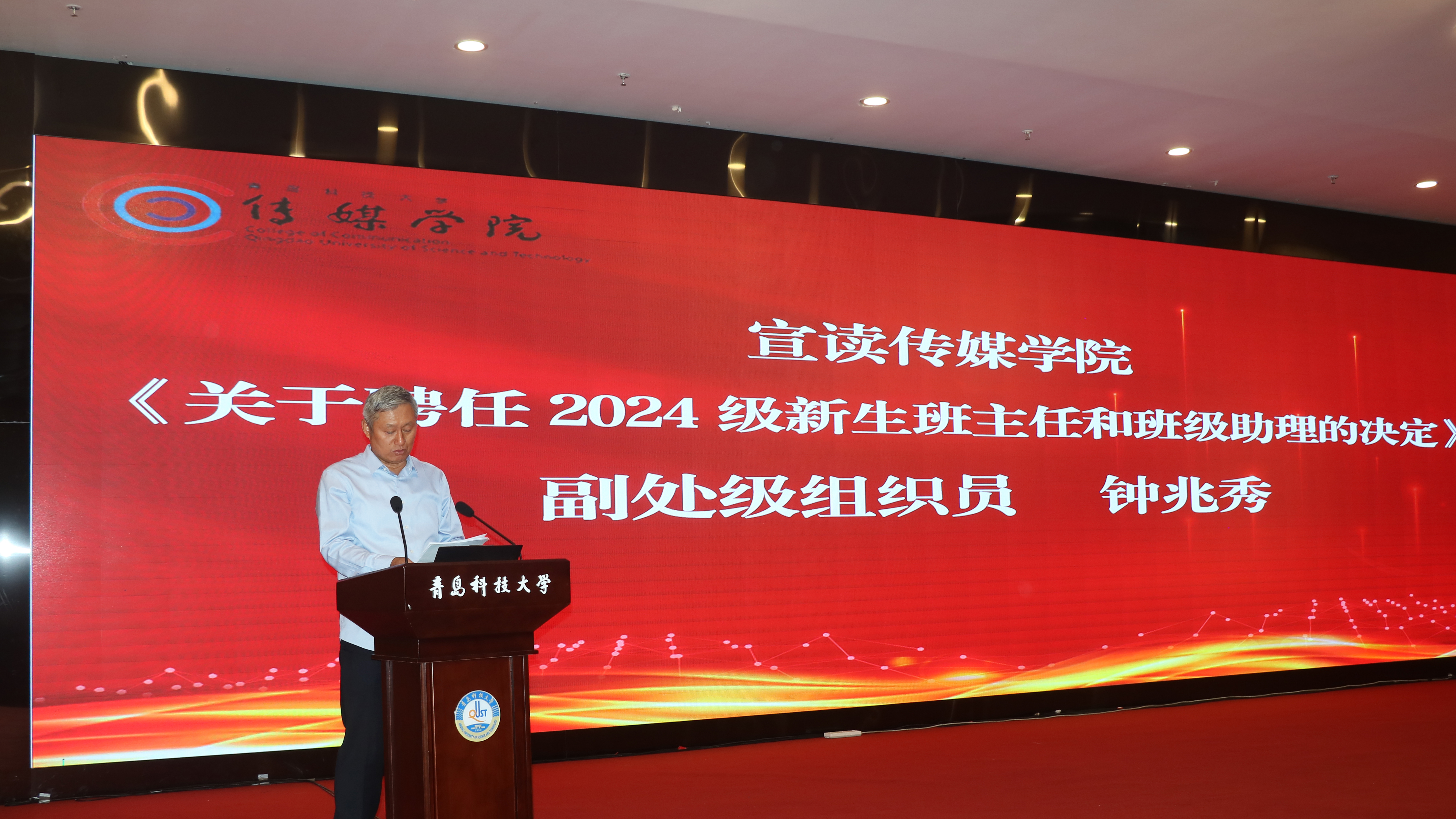 张洪坤、庄莹分别为缪潇玄等8名传媒学院2024级研究生班级助理和赵特等9名传媒学院2024级本科班级助理颁发聘书;钟兆秀宣读了《传媒学院关于聘任2024级新生班主任和班级助理的决定》。