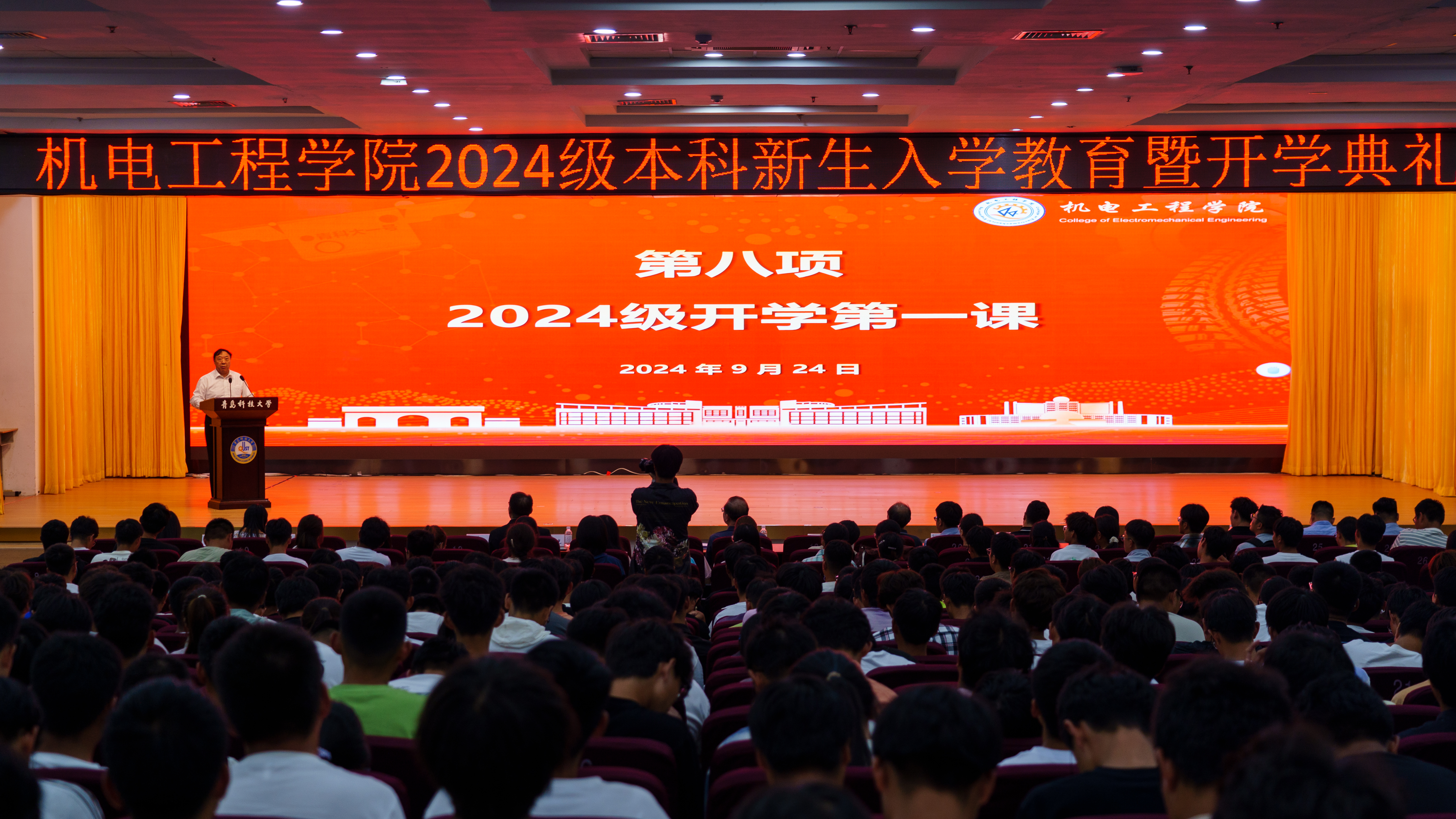 9月24日,机电工程学院2024级本科新生开学典礼暨入学教育在崂山校区第二报告厅、明德楼教室举行。学院党委书记任允晓、轮胎先进装备与关键材料国家工程研究中心主任汪传生、学院党政领导、各专业教研室主任、党支部书记、班主任代表、全体辅导员、854名本科新生参加典礼。