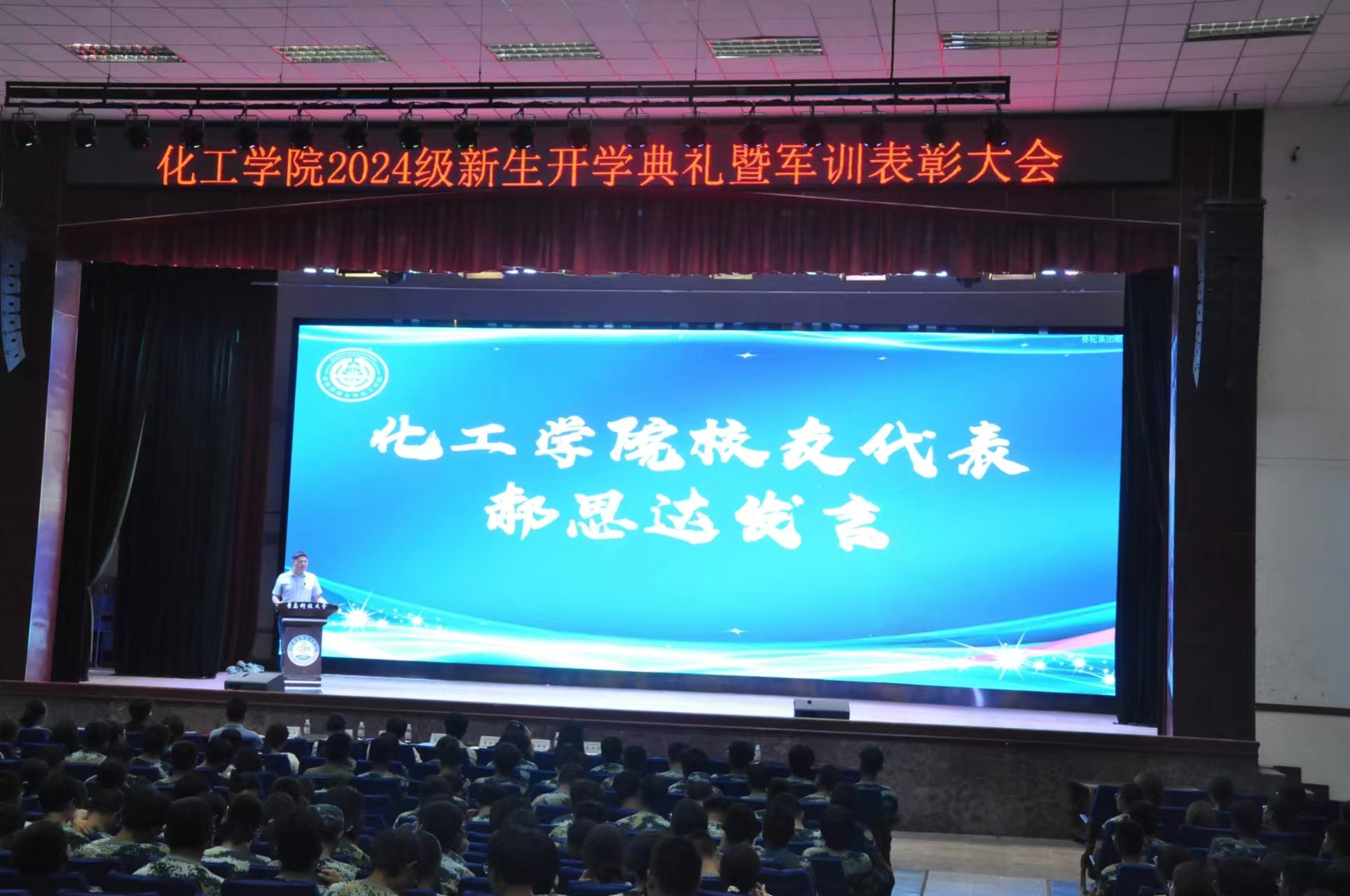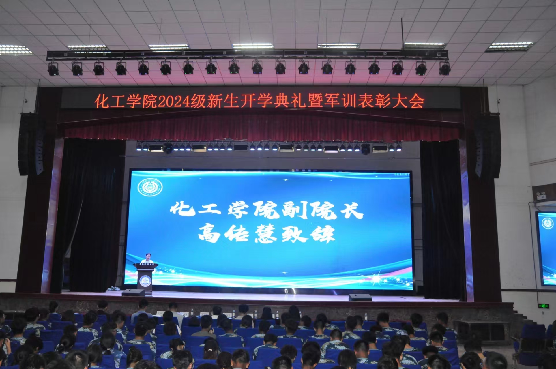 9月20日下午,化工学院2024级新生开学典礼暨军训表彰大会在四方校区西礼堂隆重举行。学院党委副书记兼副院长贾建闯、副院长高传慧、副院长李雁涛、优秀校友代表2007级化学工程与工艺专业(中国石化济南炼化公司,储运部党总支书记、副经理)郝思达、化学工程与工艺专业负责人王传兴、制药工程专业负责人张媛媛、药物制剂专业负责人张丹丹,以及化工学院各教研室教师代表、全体辅导员、2024级新生班主任代表、全体2024级新生等参加了本次大会。大会由化工学院团委书记兼学工办主任杜宗杰主持。