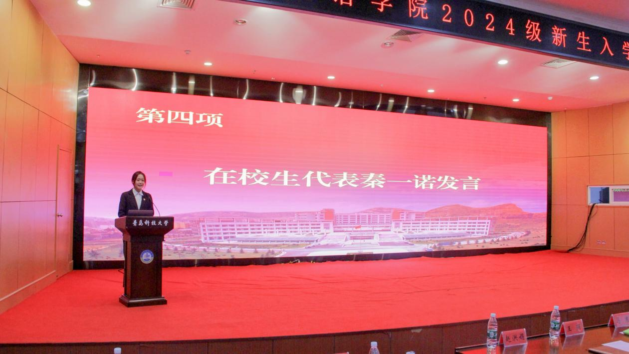 在校生代表2022级秦一诺汇报了入学两年来的收获和体会,分享了所在团队斩获“挑战杯”山东省大学生创业计划竞赛银奖的心路历程。2024级刘宇作为新生代表进行了发言。