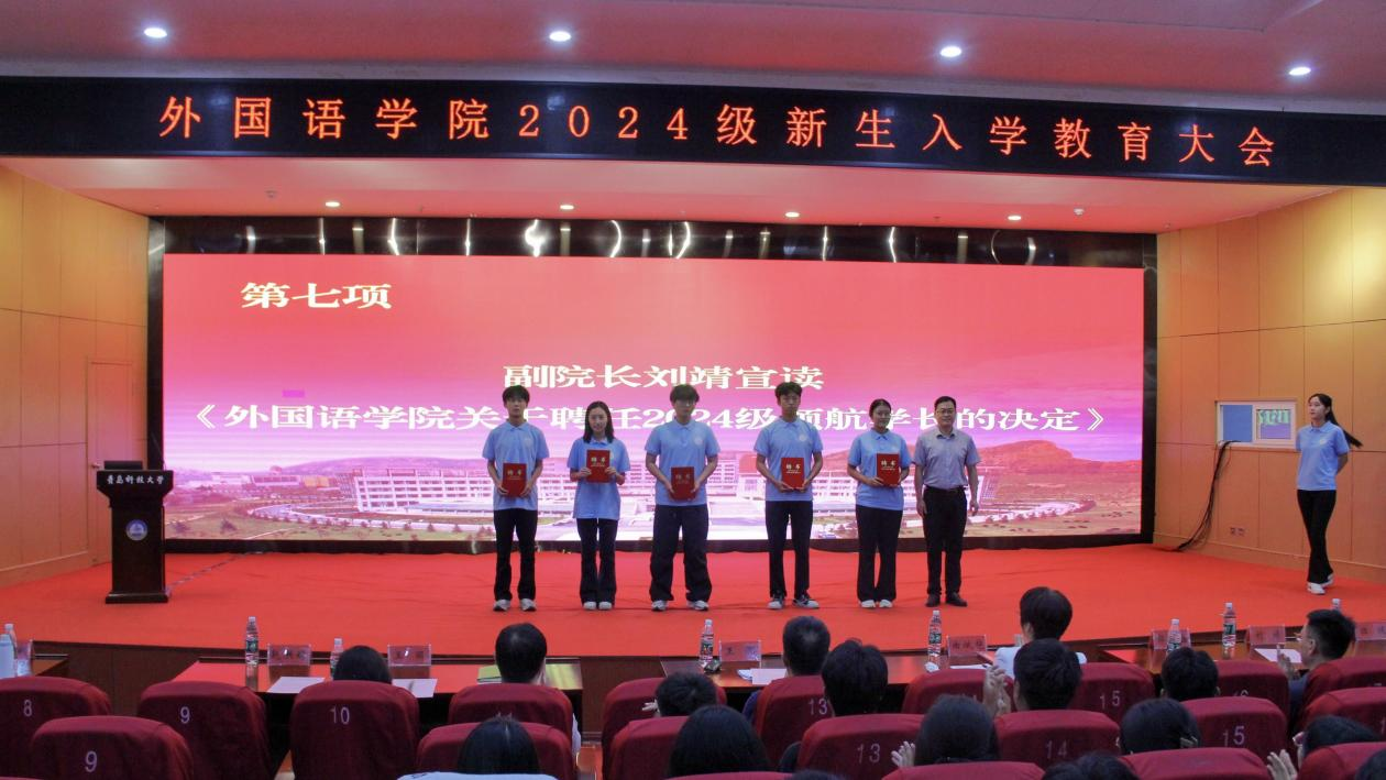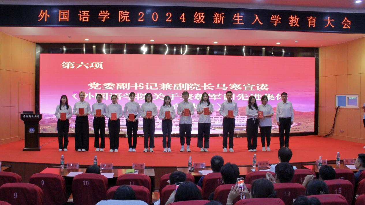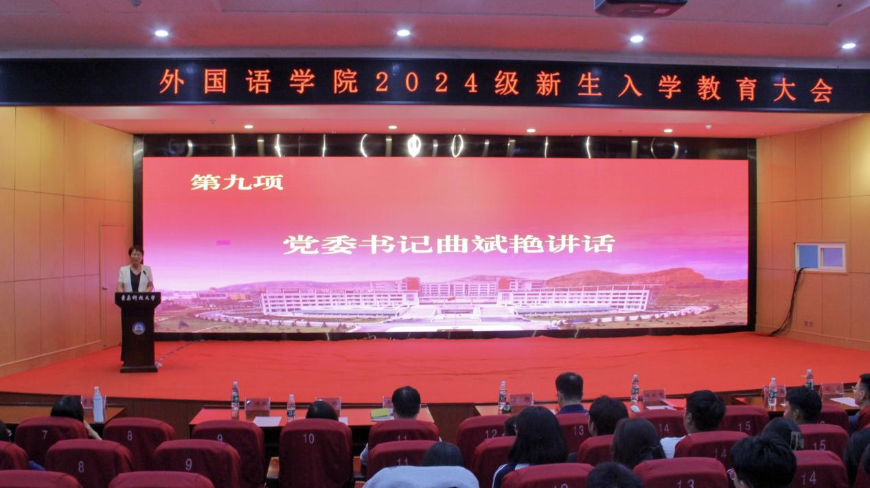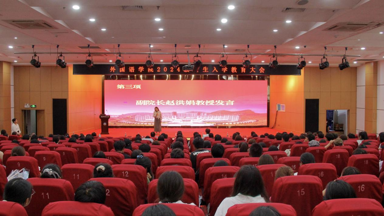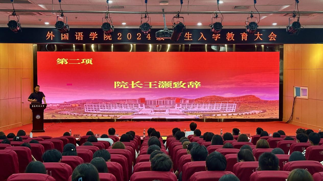 9月20日下午,外国语学院2024级新生入学教育大会在英科报告厅召开。学院党委书记曲斌艳、院长王灏、党委副书记兼副院长马寒、副院长刘靖、副院长赵洪娟、系主任、辅导员、2024级全体新生参加会议。