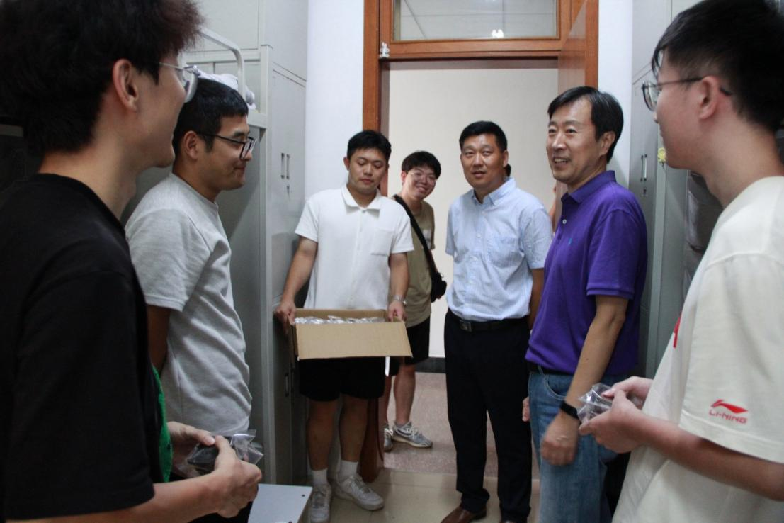 材料学院党委书记孟照国、党委副书记葛夫国在现场慰问军训新生后来到了2024级研究生新生宿舍,为在宿舍的研究生同学们发放伟德国际1949官网定制月饼。在此期间,两位书记与研究生新同学们进行了友好的交流,询问他们是否能够快速适应新的环境、叮嘱他们认真完成学业任务。字里行间都流露出对同学们的热切的关心与殷切的期望。在这个中秋,同学们不仅品尝到了月饼的香甜,更感受到了校园的温暖与师生之间的情谊。