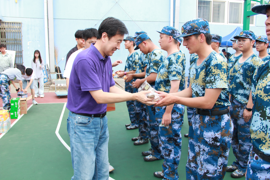 随后,党委书记孟照国、党委副书记兼副院长葛夫国向同学们发放了月饼,并将学院的祝福和问候带给了各位新同学。此外,党委书记孟照国,党委副书记兼副院长葛夫国亲手将月饼送到了指导军训的教官手中,代表学院向他们表达感谢之情,期望这次军训能够取得更好的成果,增强同学体魄和爱国主义意识。