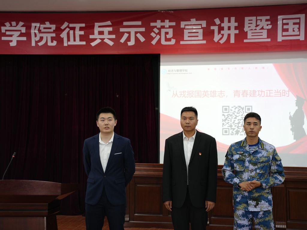 为深入贯彻落实习近平强军思想,强化国防教育,繁荣强军文化,着力培养新时代青年学生的大局观念、家国情怀和奉献精神。2024年6月4日,经管学院举办“从戎报国英雄志 青春建功正当时”征兵示范宣讲暨国防教育主题活动,校党委学生工作部副部长兼武装部副部长李春家、经管学院党委副书记牛宝卫、辅导员及21级学生共计100余人参加活动。