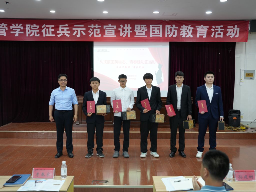 李春家为在2024年秋季征兵中响应国家号召,踊跃报名参军的经管学院毕业生代表授予“青春报国奖”。他高度肯定了经管学院的征兵工作并指出,经管学院历来重视大学生征兵和国防教育,素有尊军崇军拥军的光荣传统,涌现出了一大批退伍复学优秀大学生,以实际行动赓续红色血脉,以优异成绩谱写国防建设新篇章。