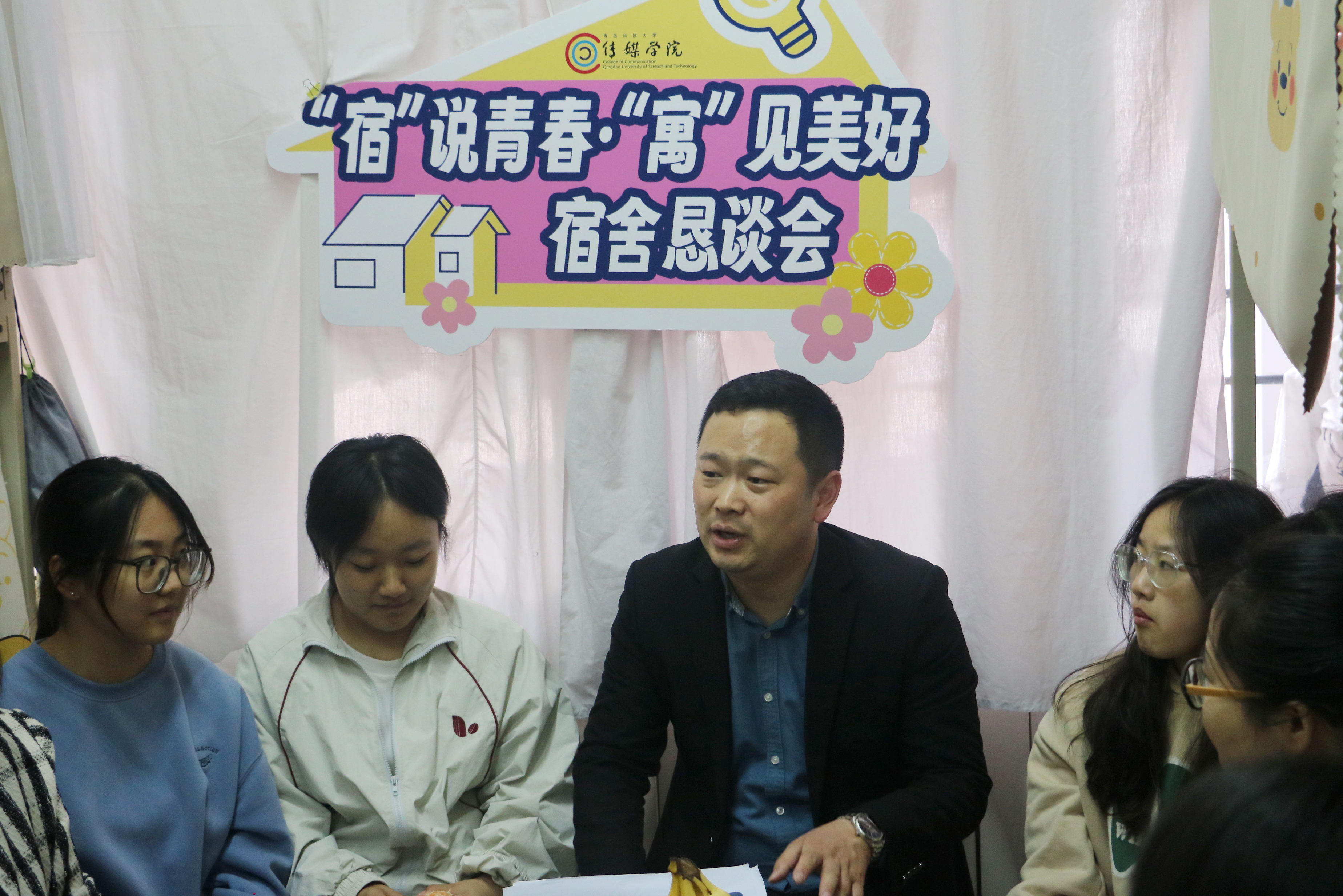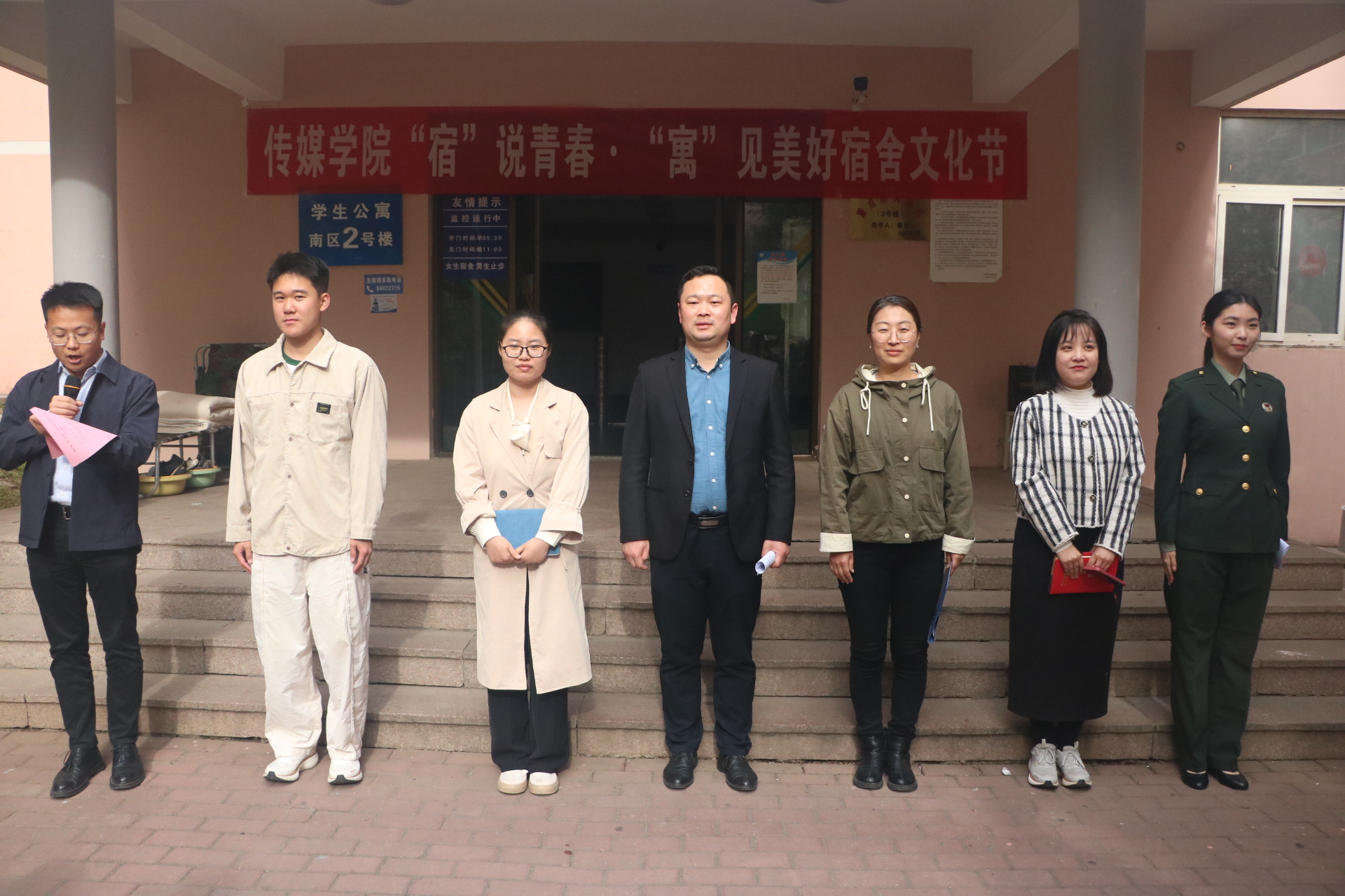 为打造“平安、健康、文明、和谐”的宿舍环境,营造积极向上的宿舍文化氛围,提升大学生文明素养,4月28日下午,传媒学院在崂山校区南苑2号宿舍楼前开展“宿”说青春·“寓”见美好宿舍文化节系列活动,学院党委副书记兼副院长刘海波、学校公寓中心隋玲老师、学院团委副书记兼学工办副主任金莹莹、张鸣,以及学院各年级舍长、学生代表等参加活动。活动由学院辅导员刘福民主持。