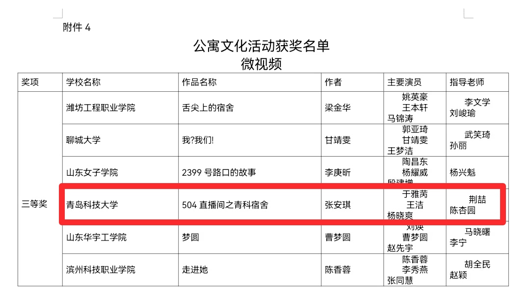 近日,山东省教育厅公布了2023年高校“公寓的故事”主题系列活动获奖名单高密校区法学与社工系2023级学生张安琪提交的作品504直播间之青科宿舍》,获公寓文化活动三等奖