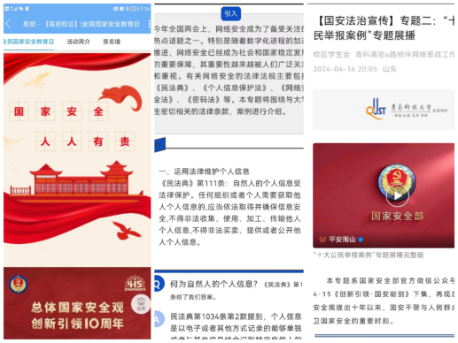 坚持安全育人,法治“e”路相伴。4月15日,高密校区开展“国安法治宣传”专题教育活动。该系列共分为五个专题,包括二十个危害国家安全的案例、政治安全、网络安全、生态安全等与大学生息息相关的国家安全领域。大学生是维护国家安全稳定、提升治理能力不可忽视的社会力量。法治教育有利于增强大学生国家安全意识和法治意识,树立法治思维,养成尊法、守法、用法、护法的行为习惯。该专题由“e”路相伴网络思政工作室联合易班工作站共同发布。