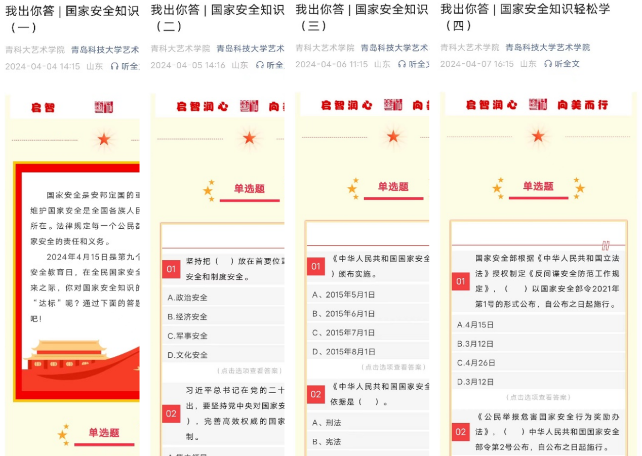 国安标语青年说,知识问答一起学。4月4日-4月7日期间,通过你出我答的形式在微信公众号连续推出四期国家安全知识轻松学。学院将国家安全知识作为进行国家安全教育的重要抓手,通过单选题、多选题、判断题等多种考察模式精心设置每一期的学习内容,确保兼顾学习内容的广度和深度。除此之外,各班级为进一步加强班级青年学生对于国家安全宣传的认识,发起了“国安标语青年说”特色活动,青年学生在国家安全宣传语思考的过程中,进一步深化自身维护国家安全主人翁角色意识。