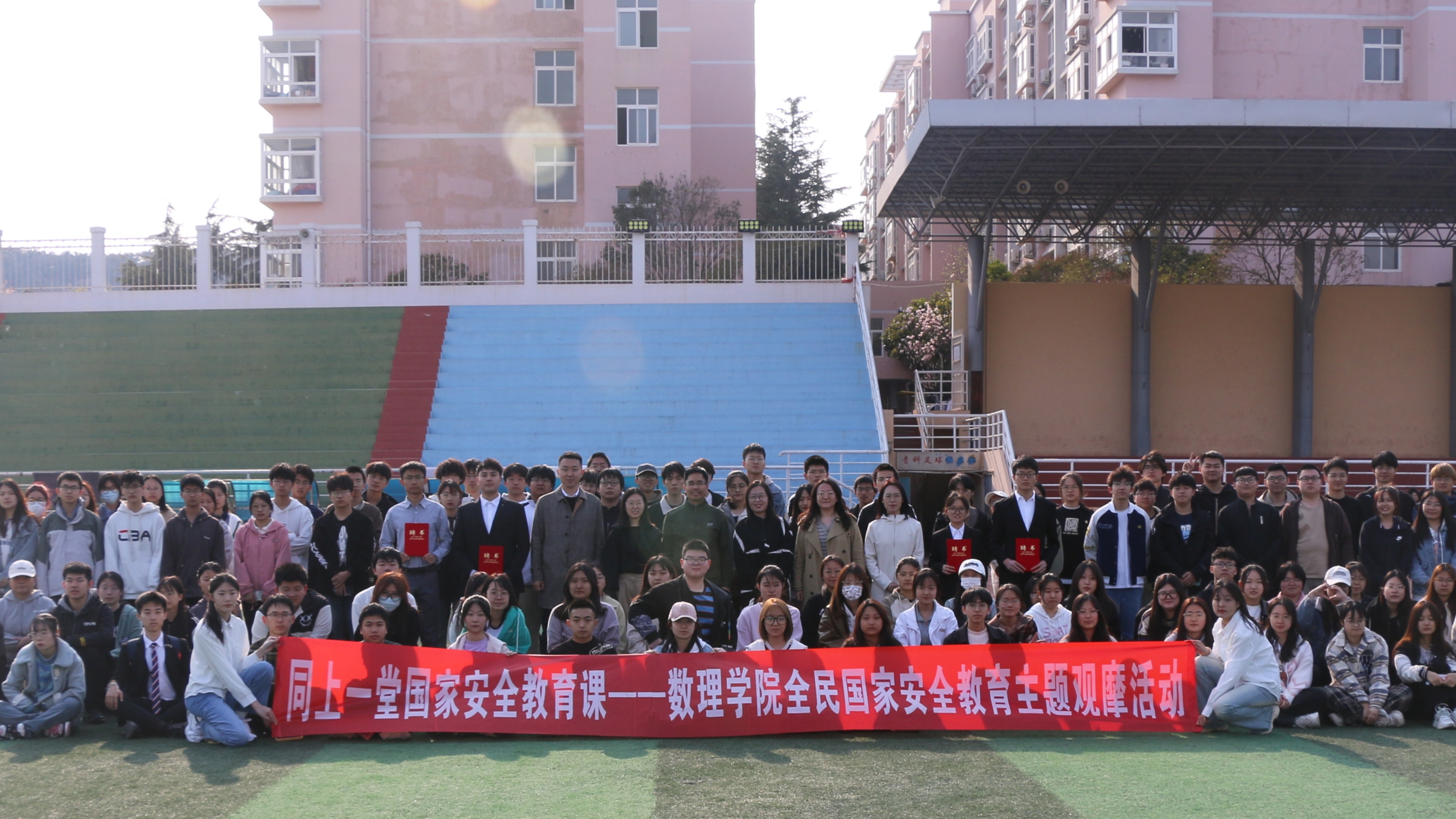 在第九个全民国家安全教育日来临之际,4月9日,数理学院在运动场上开展“同上一堂国家安全教育课”--国家安全教育主题观摩活动。学校党委学生工作部副部长兼武装部副部长李春家,数理学院党委副书记兼副院长李雯雯,信息学院、法学院等兄弟学院国防教育指导教师及各年级学生代表100余人参加观摩活动。