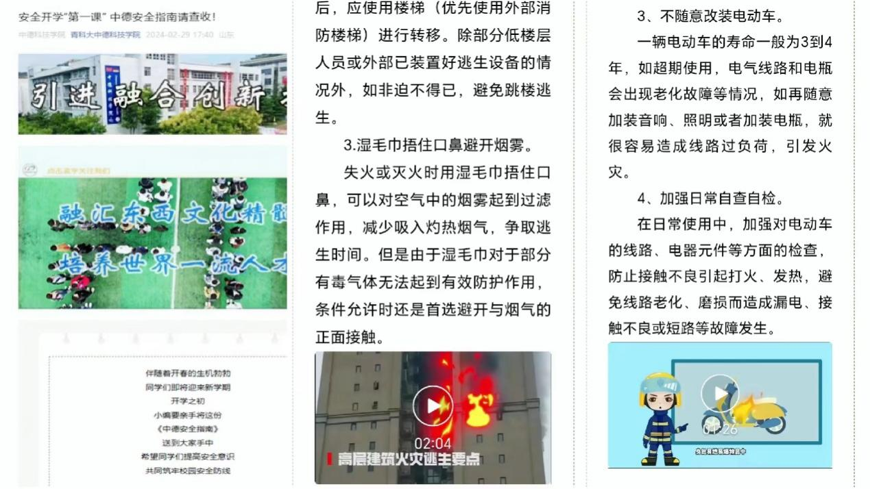 学院积极转发青科学工公众号《请一定要重视!校园电动自行车消防安全》推文,提升师生安全防范意识和防护能力。通过“青科大中德科技学院”官方微信公众号推送《安全开学“第一课”中德安全指南请查收》文章,以文字、图片、视频的形式,从消防安全篇、人身安全篇、信息安全篇、保密防范篇等方面梳理安全知识、技巧和方法,提高师生安全意识,筑牢校园安全防线。
