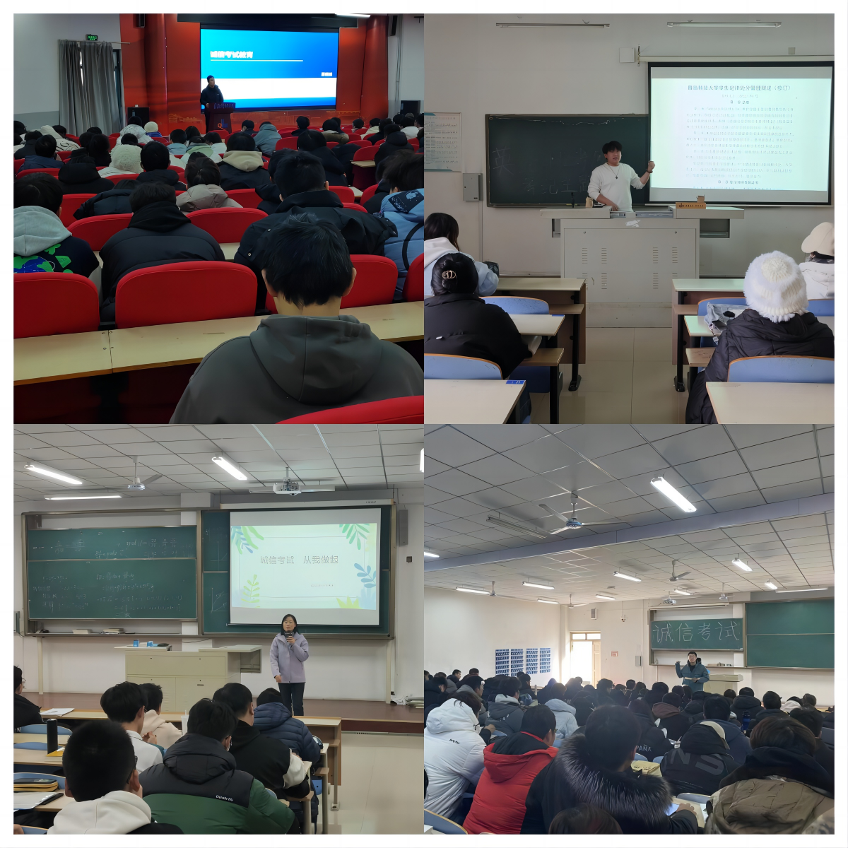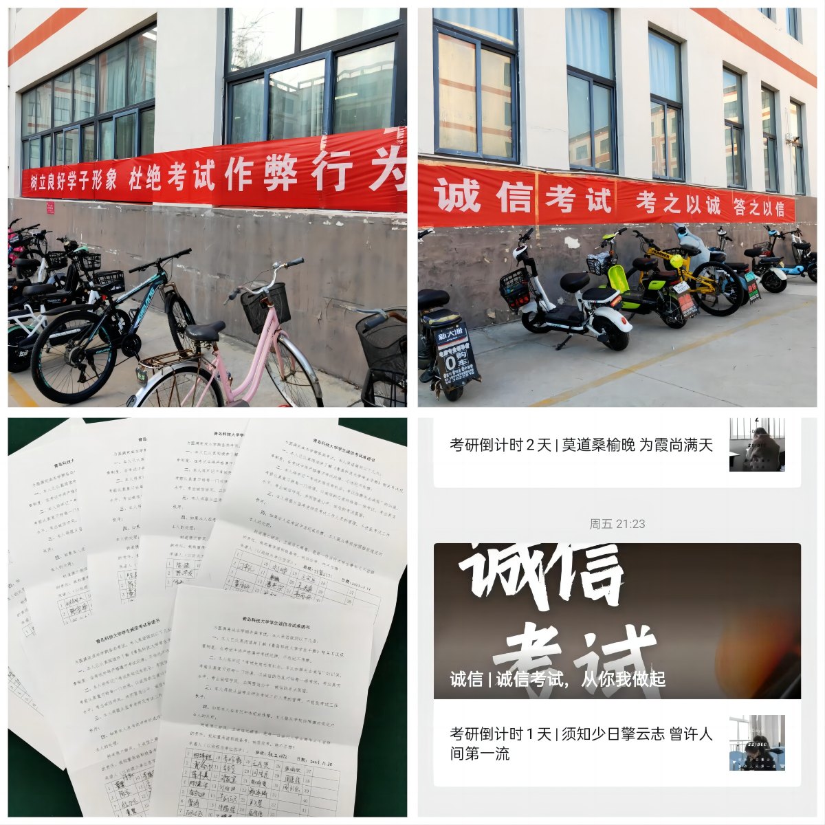线上线下营造良好考试氛围。微信公众号和易班工作站发布《诚信考试倡议书辅导员、班主任在年级QQ群、微信群等沟通平台积极引导诚信考试。M1教学楼大屏滚动播放诚信考试温馨提示考场周围悬挂宣传横幅切实把加强宣传教育、立足事前防范、提高监督意识等作为考试管理的一项基础性工作来抓。