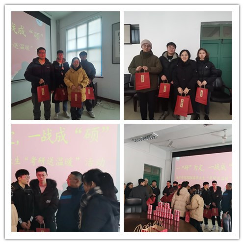 与会领导为考研学子发放考研“大礼包”,有寓意温暖守护”口罩、寓意“保重身体”退烧药、寓意“一战成硕”的定制可乐、寓意“暖心陪伴”的暖宝宝贴每一件物品都承载着学院对考研学子满满的关心和美好的祝愿。发放过程中,领导们关切询问同学们近期的学习状态及生活作息,鼓励同学们坚定自己的信心。