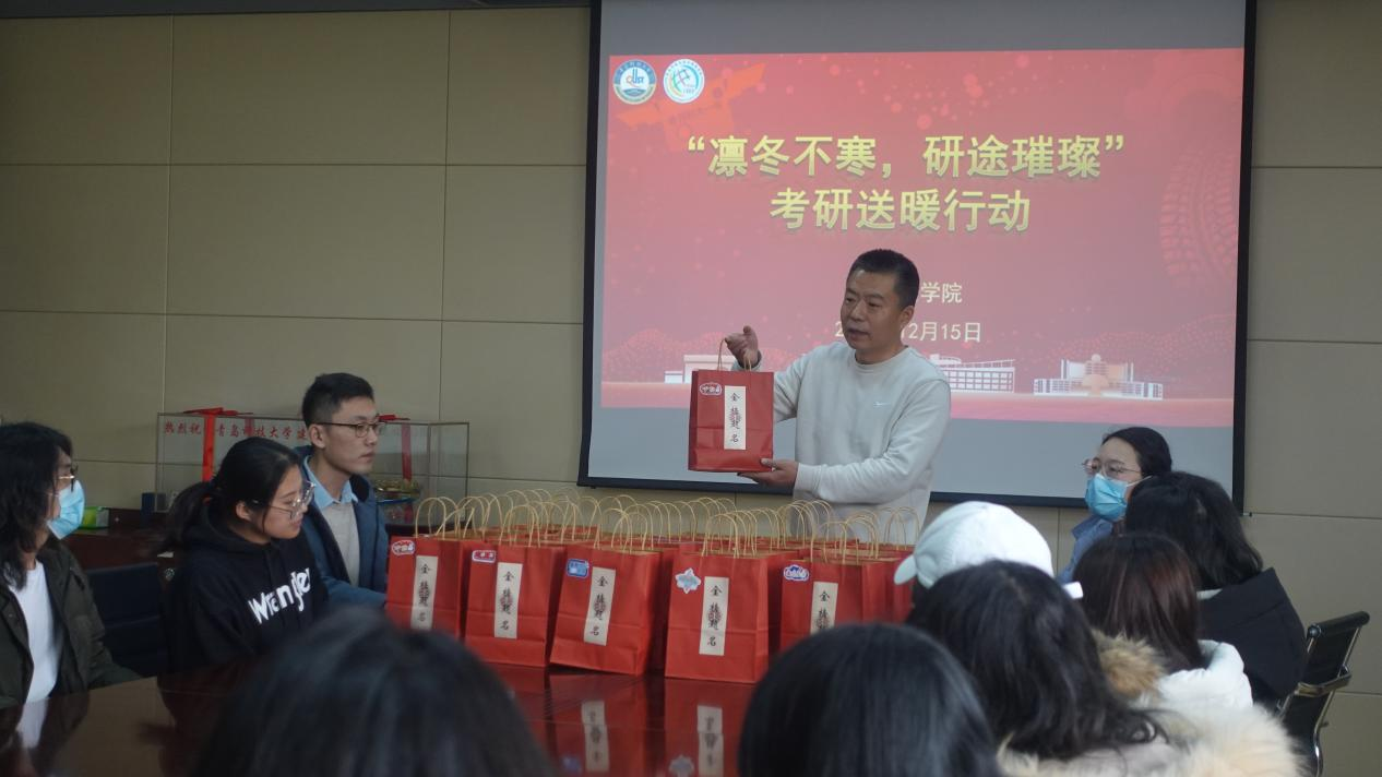 12月15日下午,为鼓舞我院毕业生学子士气,缓解备考压力,外国语学院党委副书记兼副院长刘尧老师和辅导员老师517室为考研学子送上冬日的温暖祝福和亲切关怀。