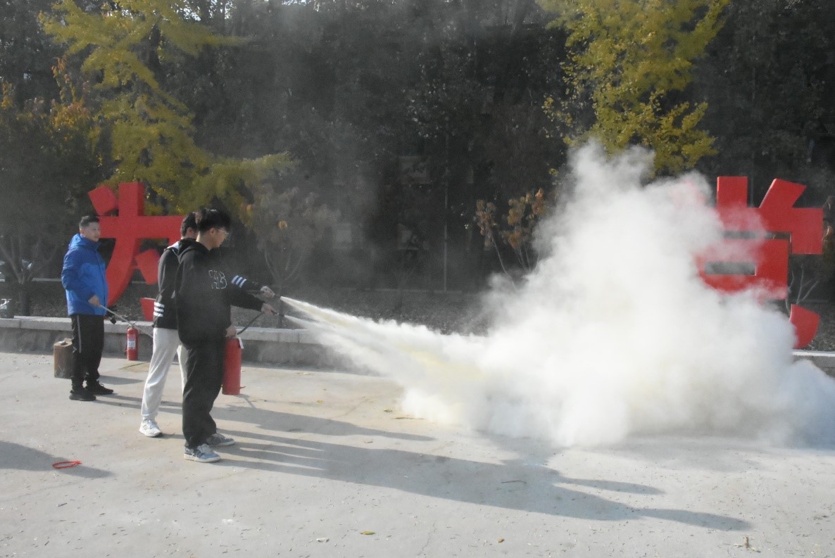随后,仇立峰老师从宿舍中如何检查和消除火灾隐患、消防应急疏散自救知识、灭火器的使用方法和注意事项等几个方面进行现场教学。讲解结束后,同学们在老师的指导下分小组轮流进行实操灭火体验。
