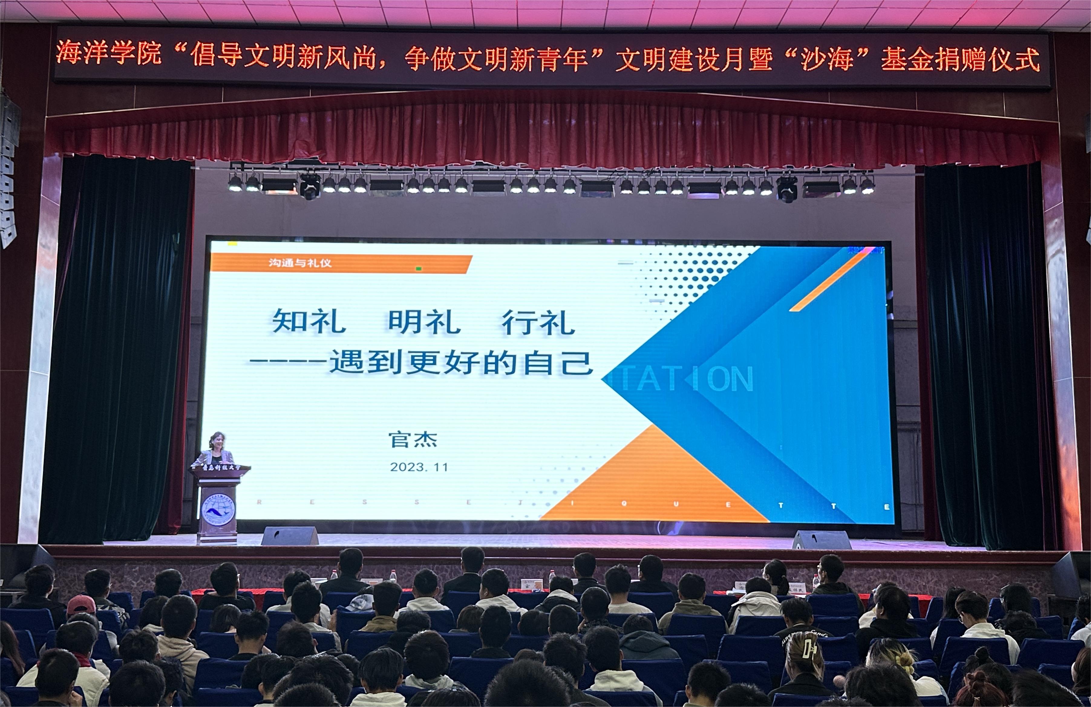 为深入开展校园文明建设,117日下午,海洋学院举行“倡导文明新风尚,争做文明新青年”文明建设月启动仪式暨“沙海”基金捐赠仪式。学校妇委会主任、数据科学学院党总支书记官杰,学生处副处长宋飞,校团委副书记李航,海洋学院班子成员周宪锋、李昉、臧传永,院长助理孟祥民,学院全体学生及教师代表参加活动。