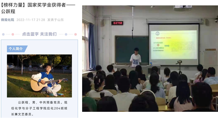 我院积极培树国家奖学金、国家励志奖学金获得者、自立自强标兵等先进典型,通过微信公众号等宣传方式对优秀学生事迹进行宣传,充分发挥朋辈青年的示范引领作用,用学生身边的优秀真实事例,大力弘扬时代精神,讲好资助故事,激励广大学子成长成才,展现奋斗风采。同时,开展优秀榜样讲座,重点对科研创新、学习方法等进行讲解,起到传帮带作用。
