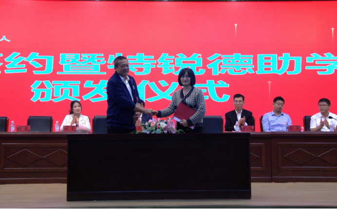 会上,与会领导嘉宾为获得首届“特锐德”助学金的同学颁发助学金。