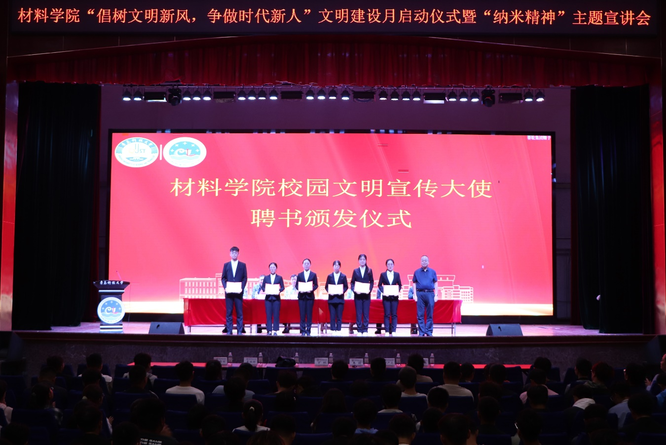 为进一步加强学院青年学生基础文明教育,规范学生文明行为习惯,引导青年学生以积极向上的精神风貌迎接新一轮本科教育教学审核评估工作,10月10日下午,材料学院在四方校区西礼堂举行“倡树文明新风,争做时代新人”文明建设月启动仪式暨“纳米精神”主题宣讲会。学校党委常委、副校长丁林,党委学生工作部部长、学生工作处处长王丽,材料学院领导班子出席活动,学院23级全体学生、主要学生干部及师生代表参加活动。