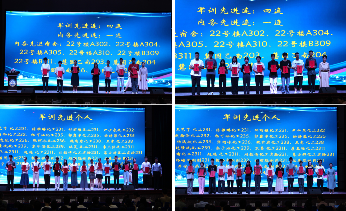 制药202程玉帅同学作为在校生代表发言,呼吁新生在大学这场自己与自己奋斗的旅程中,将学习、奋斗、坚持与自立作为学生的第一任务。新生代表、化工235班郭鑫宇同学讲述了自己对大学生活的认识,并对今后四年的美好生活进行了畅想。“今后,我们将共同肩负青科大的责任和使命,一起见证青科大的发展和繁荣,共同谱写属于青科大的壮美华章。”副院长王许云宣读了《关于表彰化工学院2023级新生军训先进集体和优秀个人的决定》,与会领导、老师为获奖的集体和个人颁发了荣誉证书。