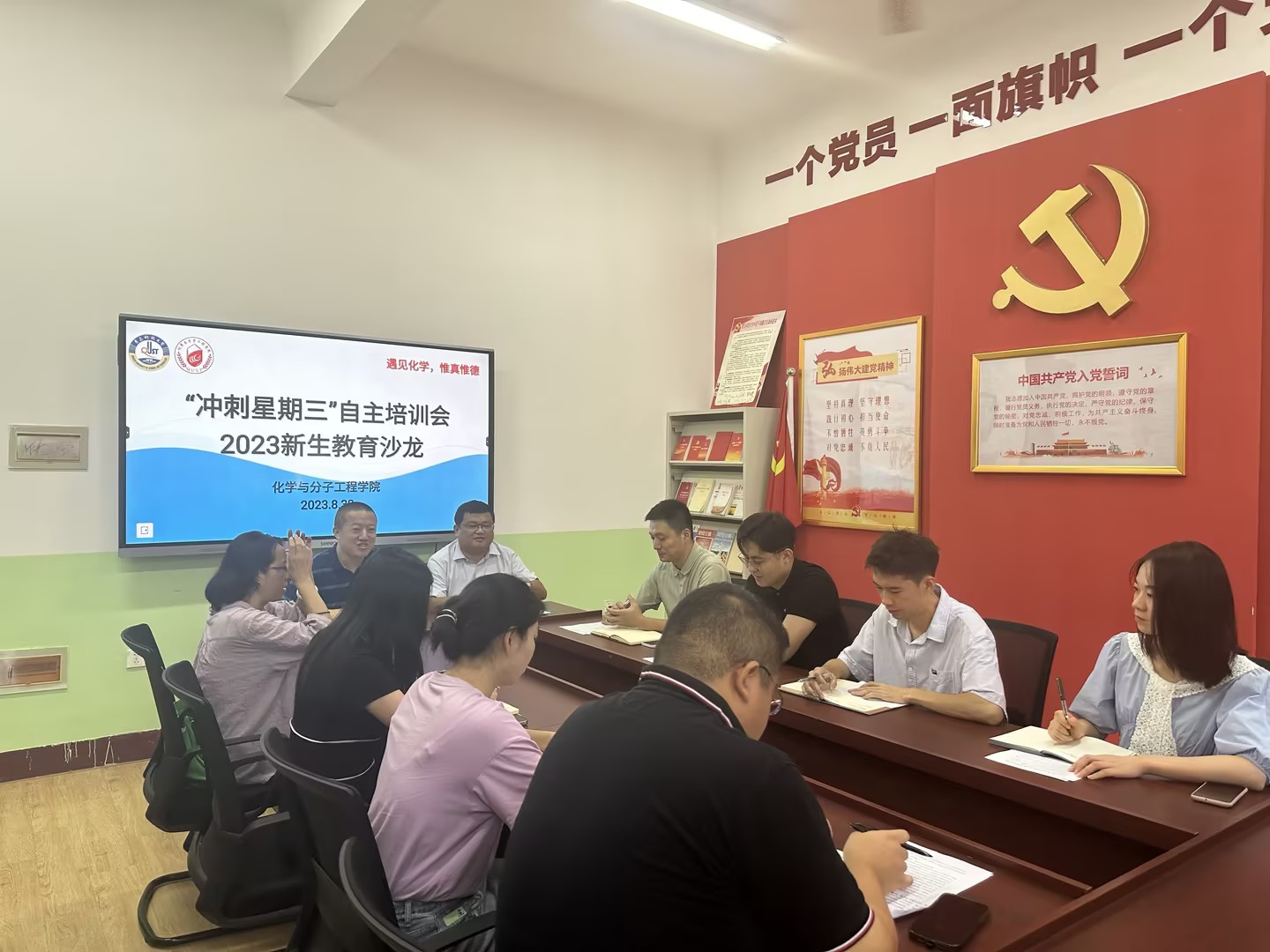 8月30日,化学院2023年度第三次自主培训在学院党建活动室举行。培训结合学院“冲刺星期三”工作品牌,聚焦“2023级新生教育”主题。学生处副处长宋飞、学工办全体辅导员、班主任代表、校学生会主席、院学生会主席、化学爱好者协会会长参加会议。会议由学院党委副书记杨小明主持。