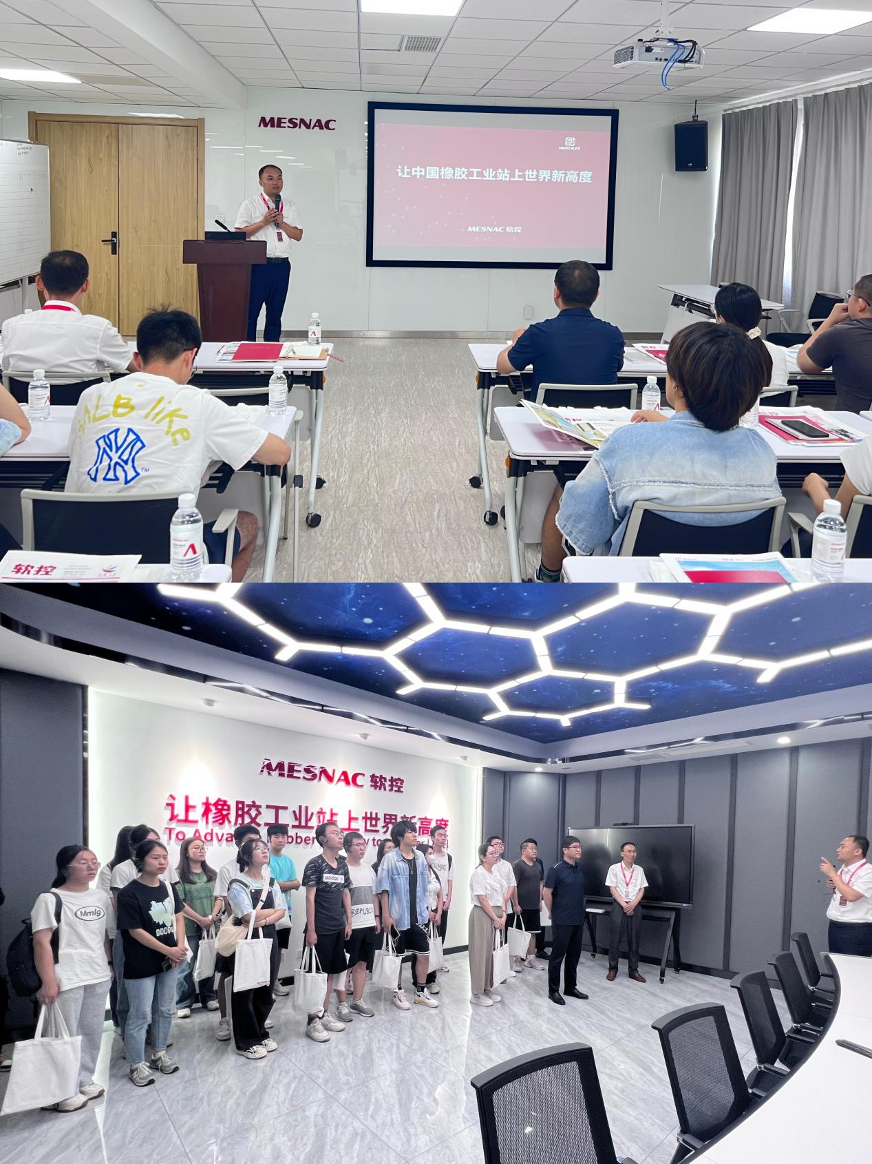 在软控股份有限公司产业,自动化学院05届校友、软控橡塑科技事业部总经理薄夫修,软控研究院副院长刘云成,品牌文化办公室主任李令新 ,人力资源经理张爱华分别从软控的发展历程和企业文化,近年来公司在产品创新、智能技术、多赛道发展布局等方面取得的成果及人才发展等方面介绍了公司的基本情况。随后,全体师生实地参观产业园中橡机产线车间,深入了解公司现代化智能生产管理及5S标准化管理模式。